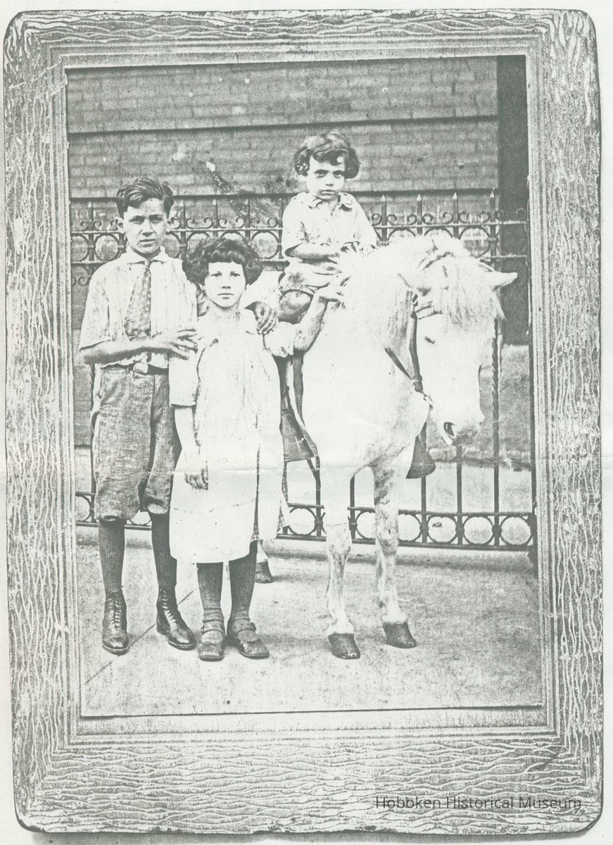 Black-and-white photocopy of photo of Frank Ratti, Mary Ratti and Anthony Ratti with a pony outside School No. 8, 700 Adams St., Hoboken, 1925.