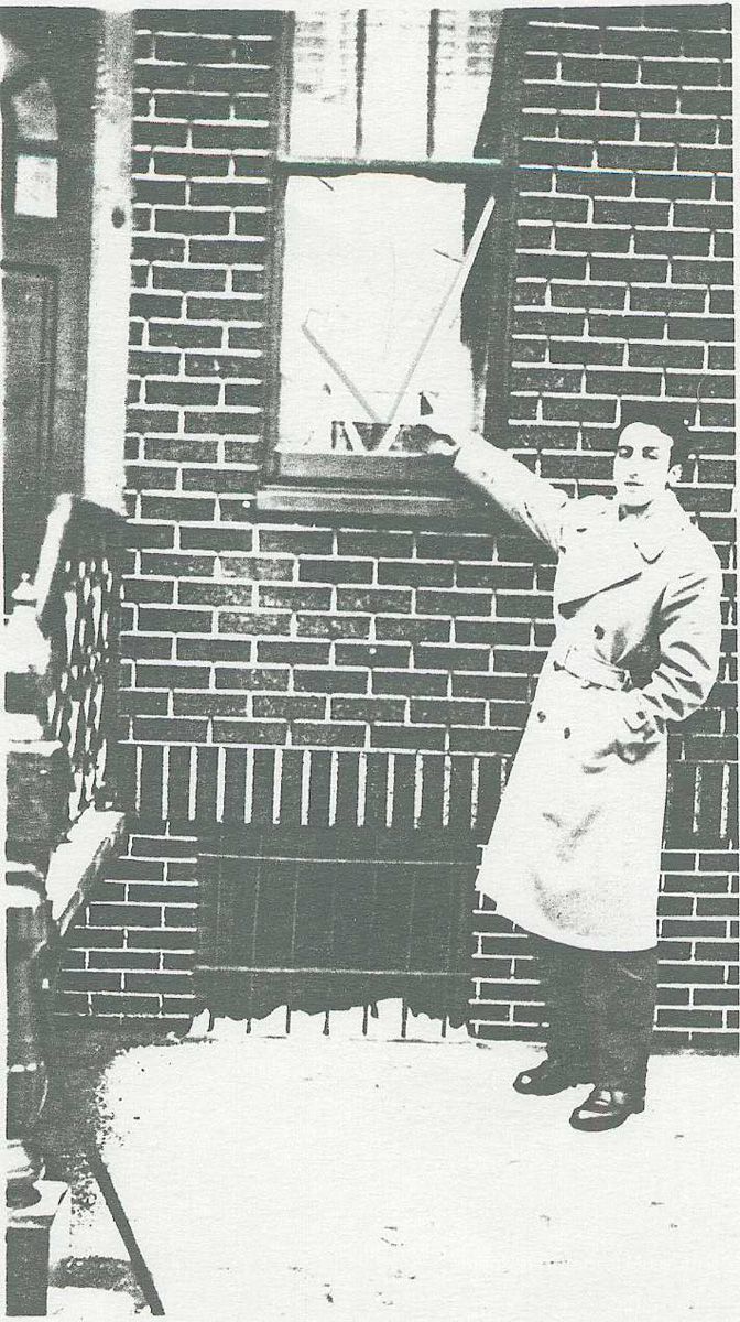 Black-and-white photocopy of photo of Joseph Ratti pointing to a Victory flag in the window at 721 Adams St., Hoboken, 1944.