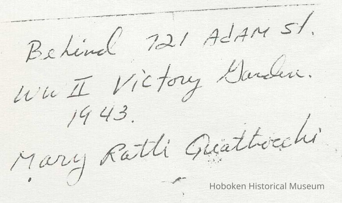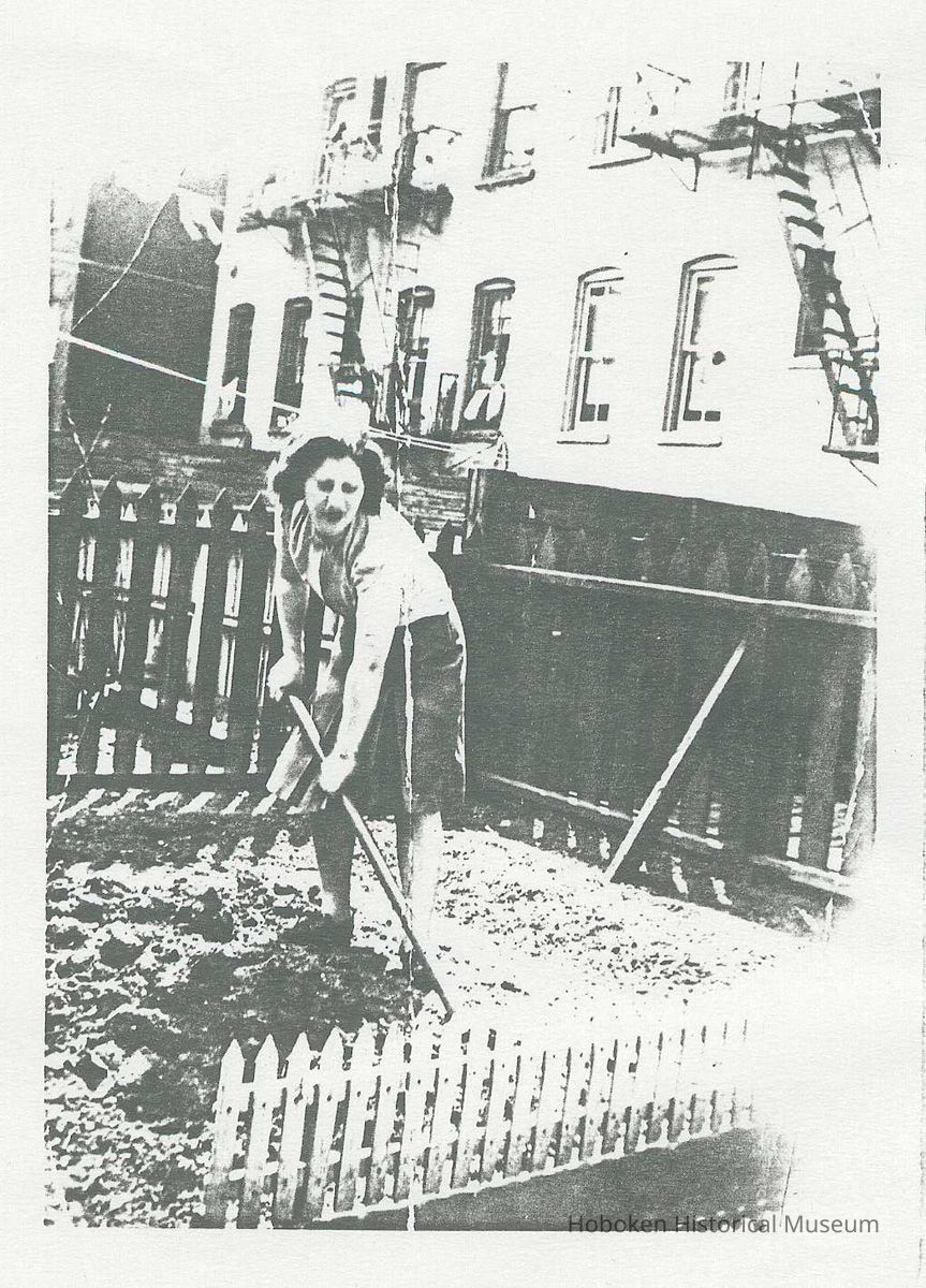 Black-and-white photocopy of photo of Mary Ratti Quattrocchi using a hoe in a World War II Victory Garden behind 721 Adams St., Hoboken, 1943.