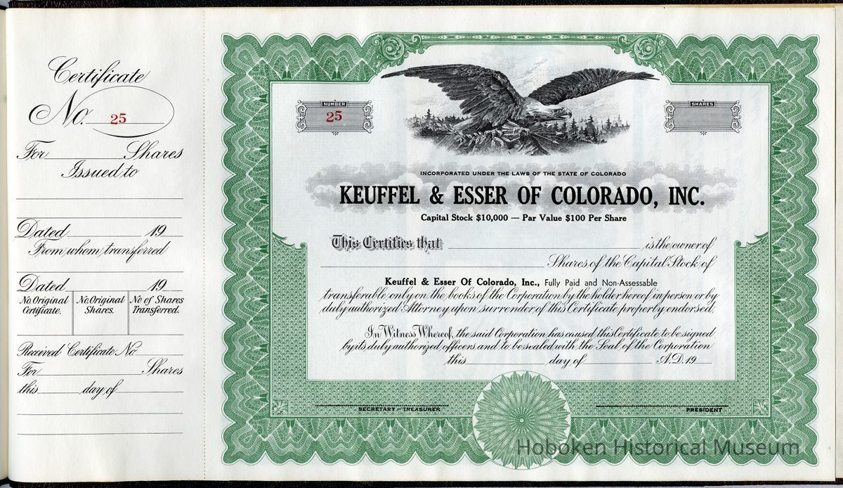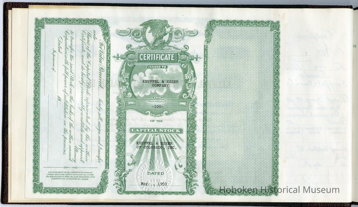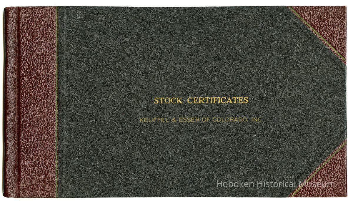 This certificate is in a bound volume titled on cover: Stock Certificates, Keuffel & Esser of Colorado, Inc. It holds the issued certificate number 1 and unissued certificates numbers 2 to 25. Inside front cover at endleaves is a blank stub inkstamped "Specimen"; the specimen certificate was detached and is not present.
