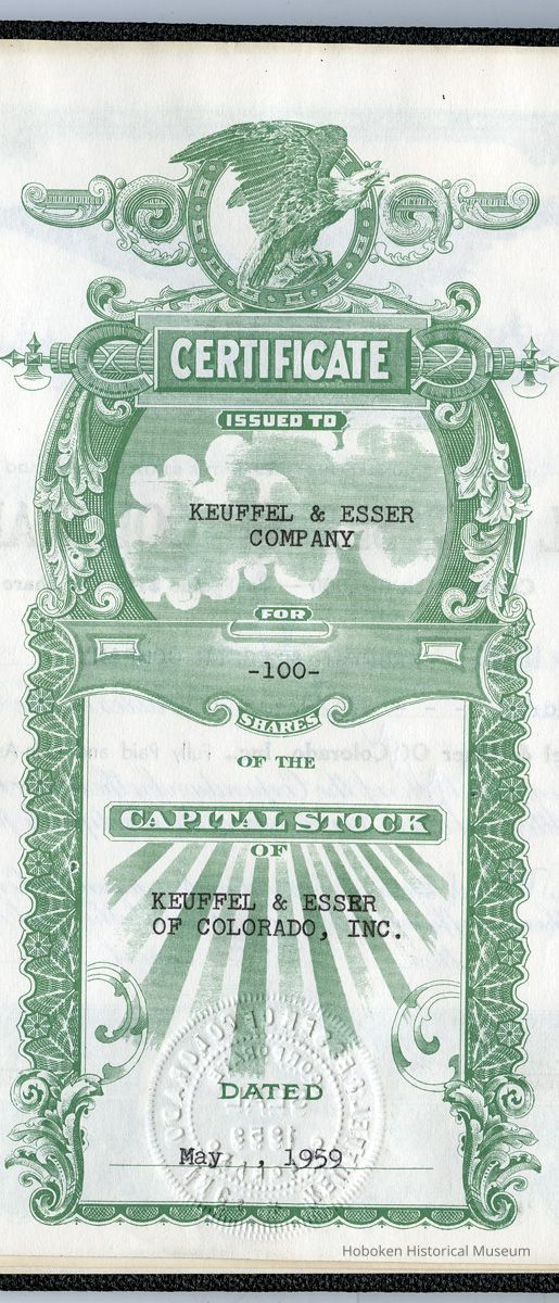 Stock certificate no. 1 of Keuffel & Esser of Colorado, Inc., for 100 shares of capital stock, par value $100, "Original Issue"; issued to Keuffel & Esser Company (Hoboken, N.J.), May 19, 1959. Dissolved Dec. 12, 1961.