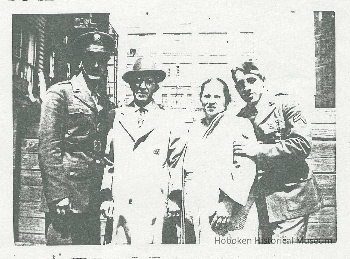Black-and-white photocopy of photo of Joey Patti, Sebatiano Patti, Philomina Patti and Carmine Patti in an unidentified back yard, Hoboken, no date, ca. 1942-45. The two men are in military uniform.