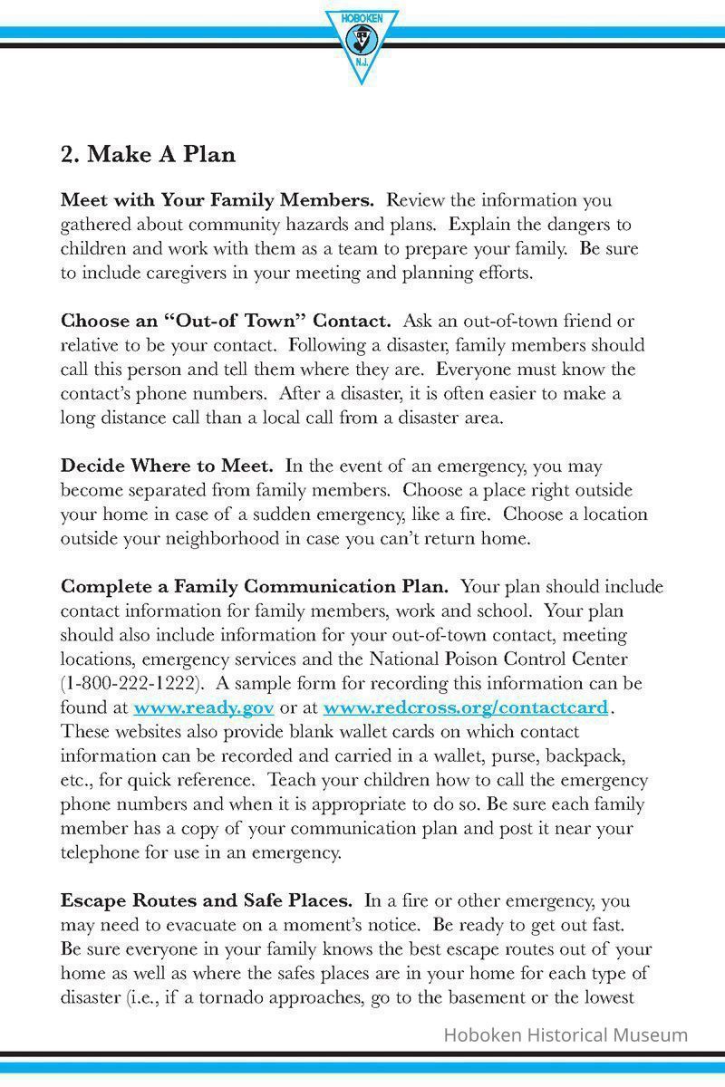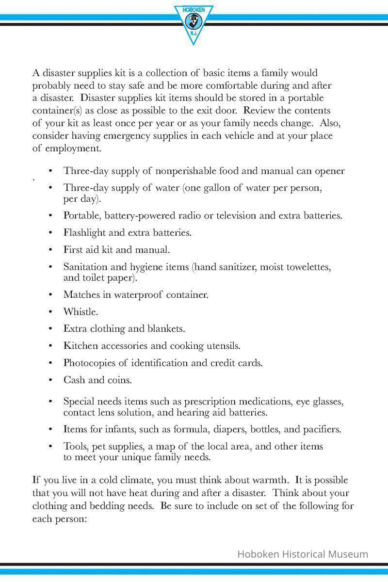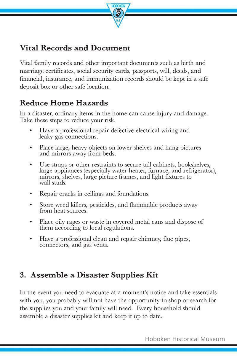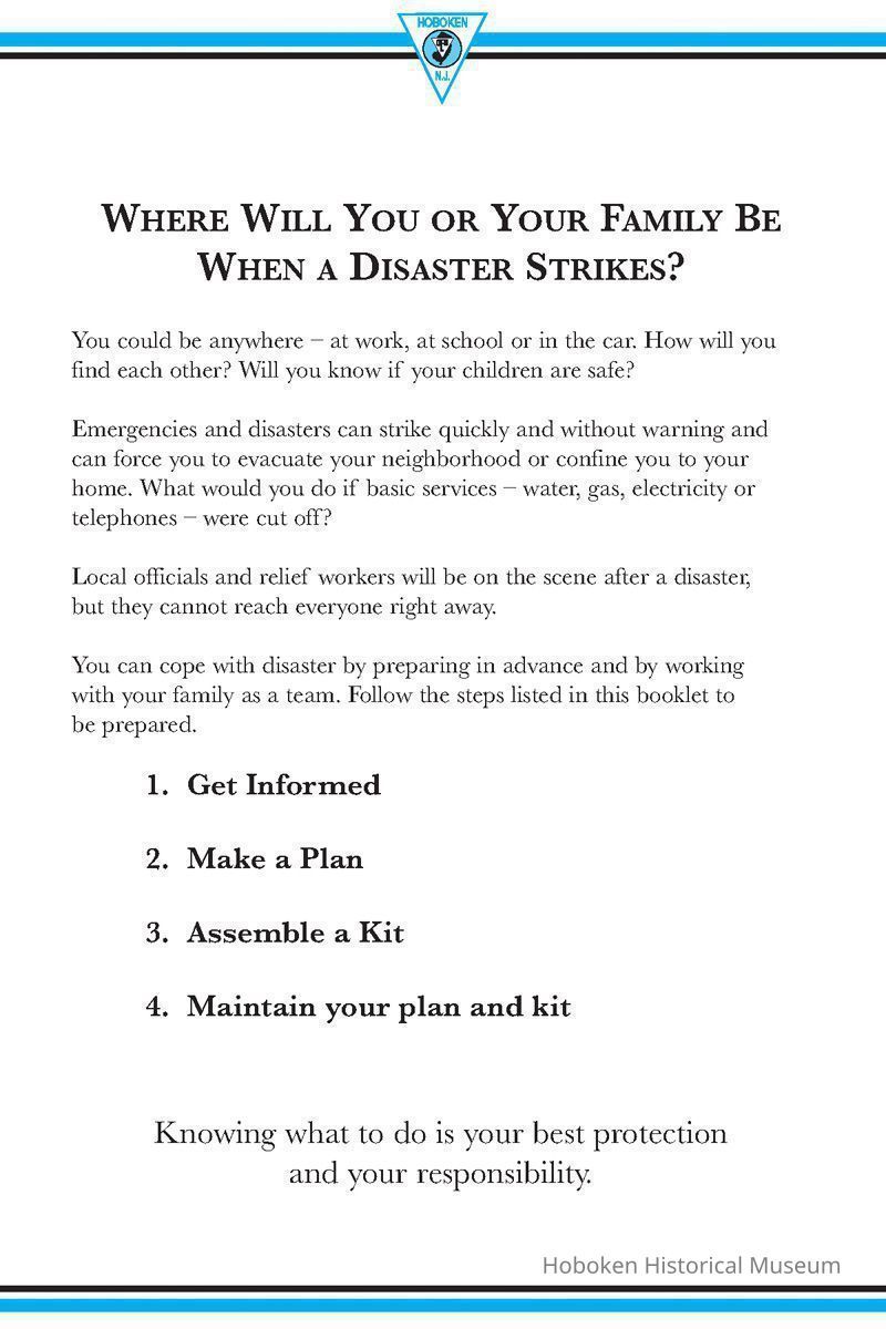 Thirty-one page booket (digital format, PDF; on file) being a locally adapted Federal Emergency Management Agency (FEMA) publication on disaster planning and preparedness for individuals and families. A manual issued initially as part of response to September 11th, it has continued to made available by the City of Hoboken with renewed emphasis due to the impact and aftermath of Hurricane (Superstorm) Sandy. This publication was still available online in 2014 at this official city website, URL: http://www.hobokennj.org/ready/