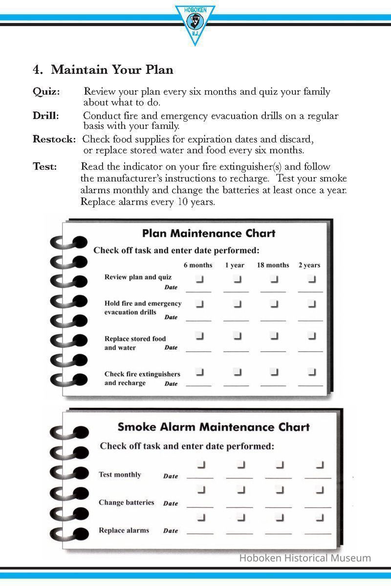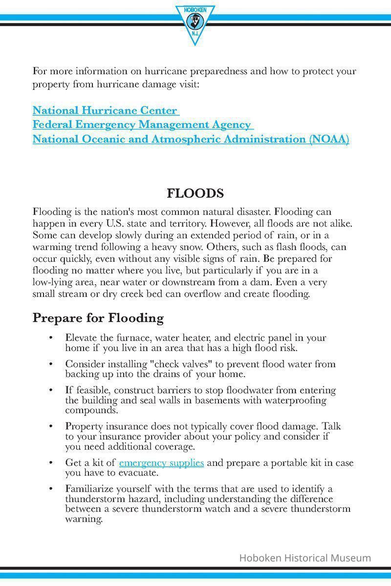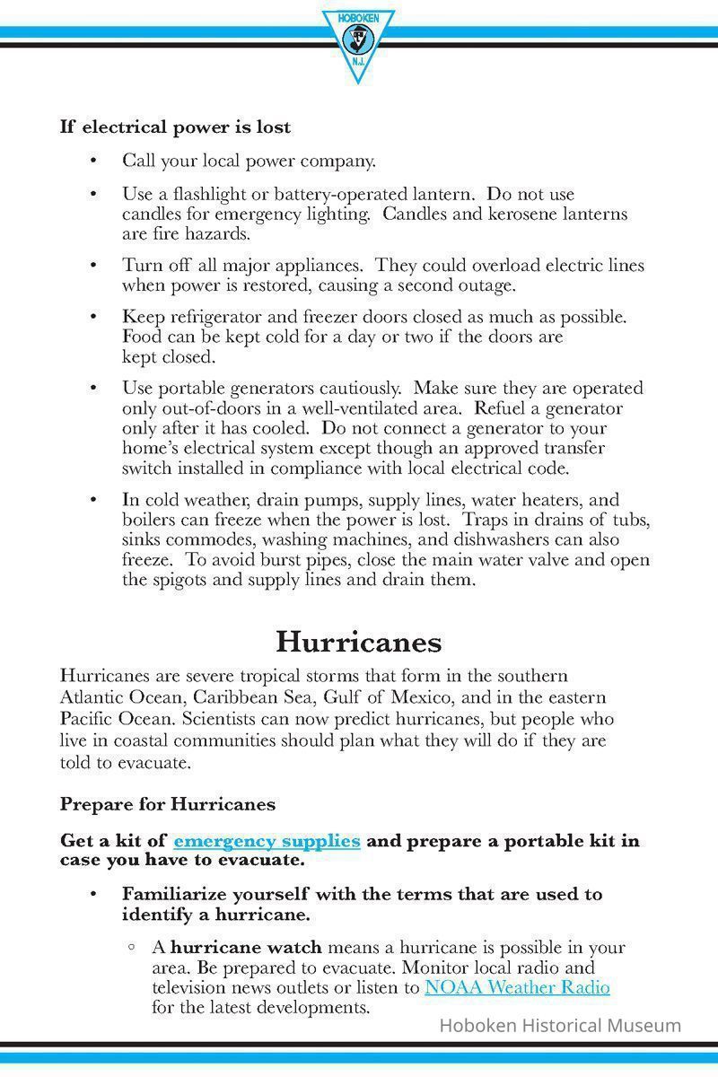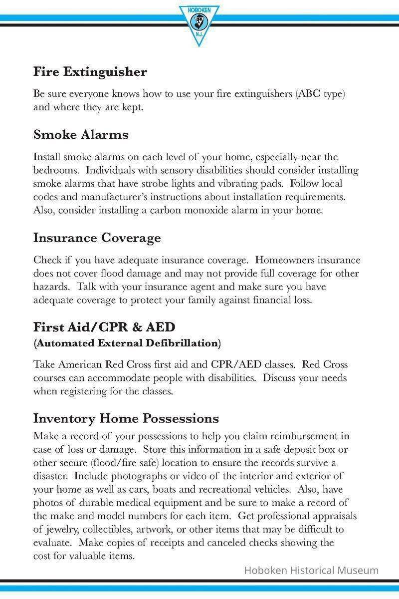 Thirty-one page booket (digital format, PDF; on file) being a locally adapted Federal Emergency Management Agency (FEMA) publication on disaster planning and preparedness for individuals and families. A manual issued initially as part of response to September 11th, it has continued to made available by the City of Hoboken with renewed emphasis due to the impact and aftermath of Hurricane (Superstorm) Sandy. This publication was still available online in 2014 at this official city website, URL: http://www.hobokennj.org/ready/