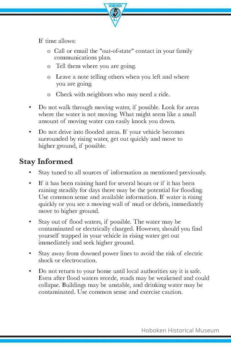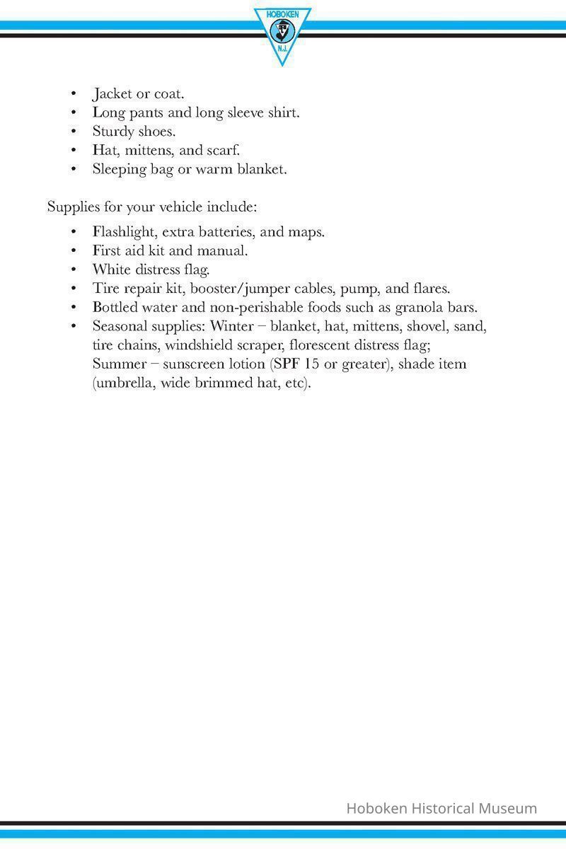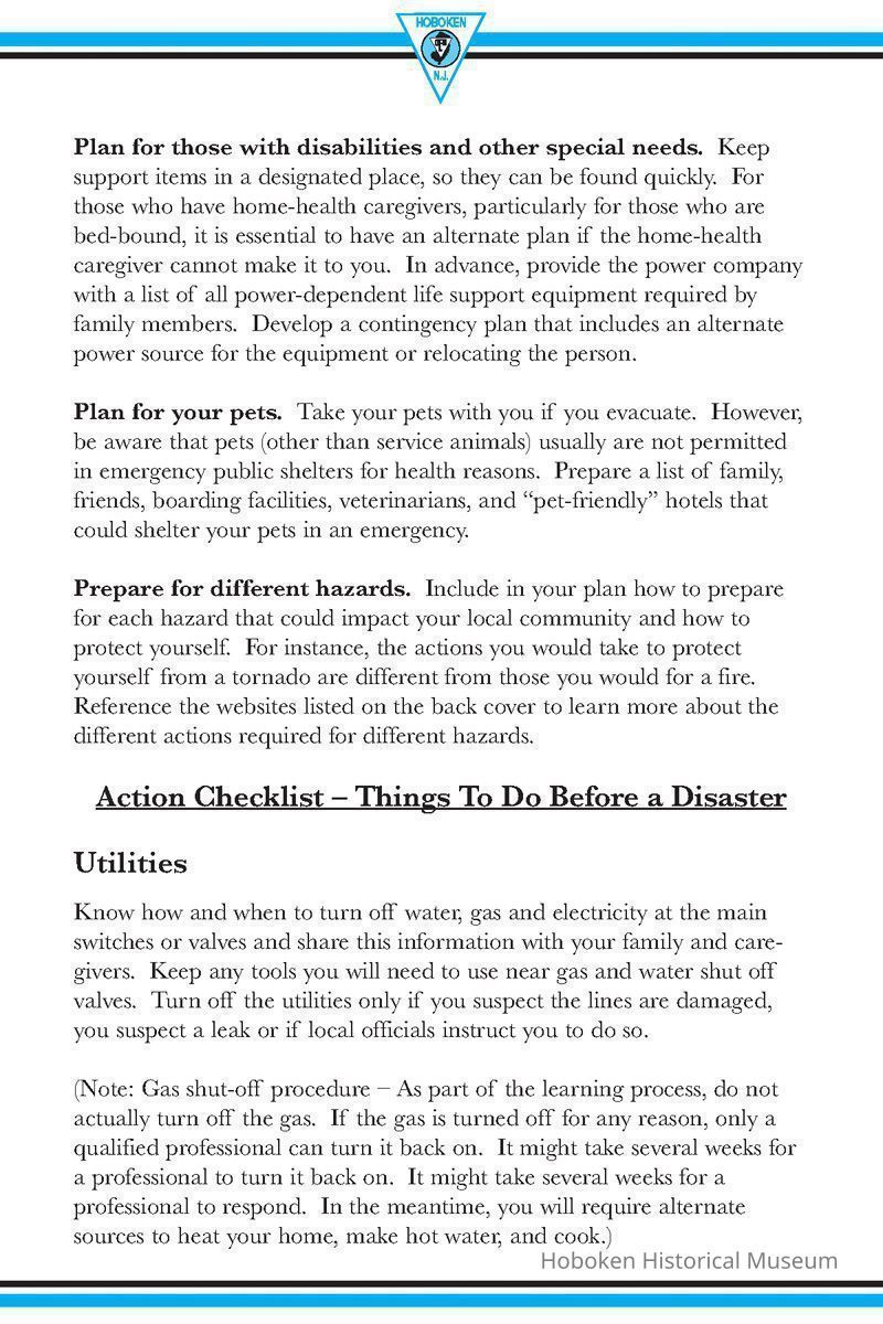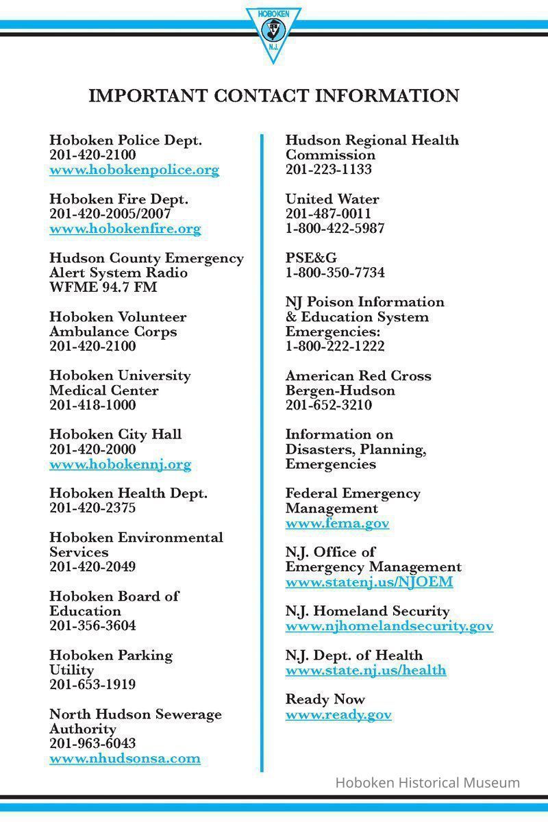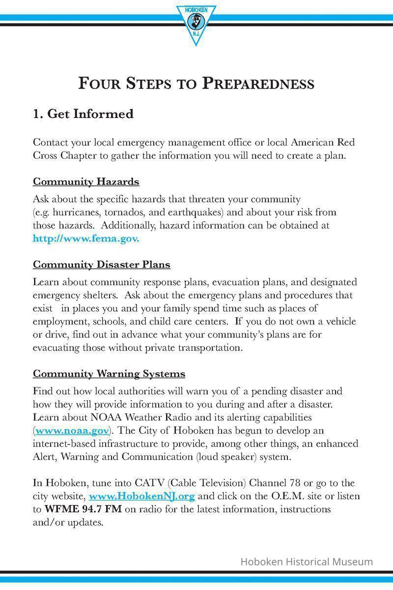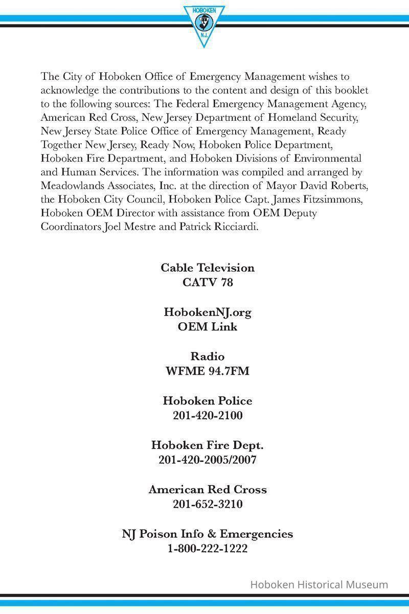 The City of Hoboken Office of Emergency Management wishes to acknowledge the contributions to the content and design of this booklet to the following sources: The Federal Emergency Management Agency, American Red Cross, New Jersey Department of Homeland Security [cataloguer's note: this agency was established in 2006], New Jersey State Police Office of Emergency Management, Ready Together New Jersey, Ready Now, Hoboken Police Department, Hoboken Fire Department, and Hoboken Divisions of Environmental and Human Services.