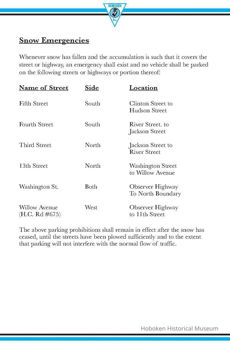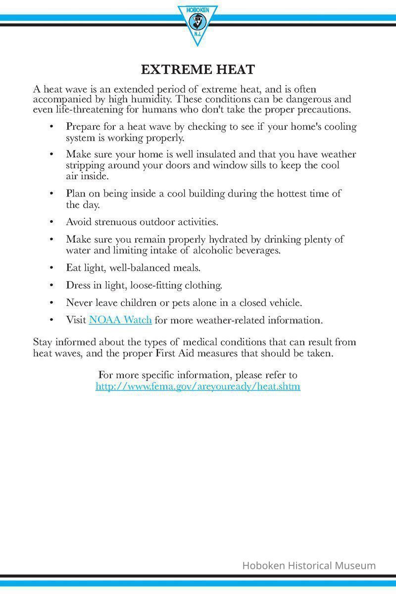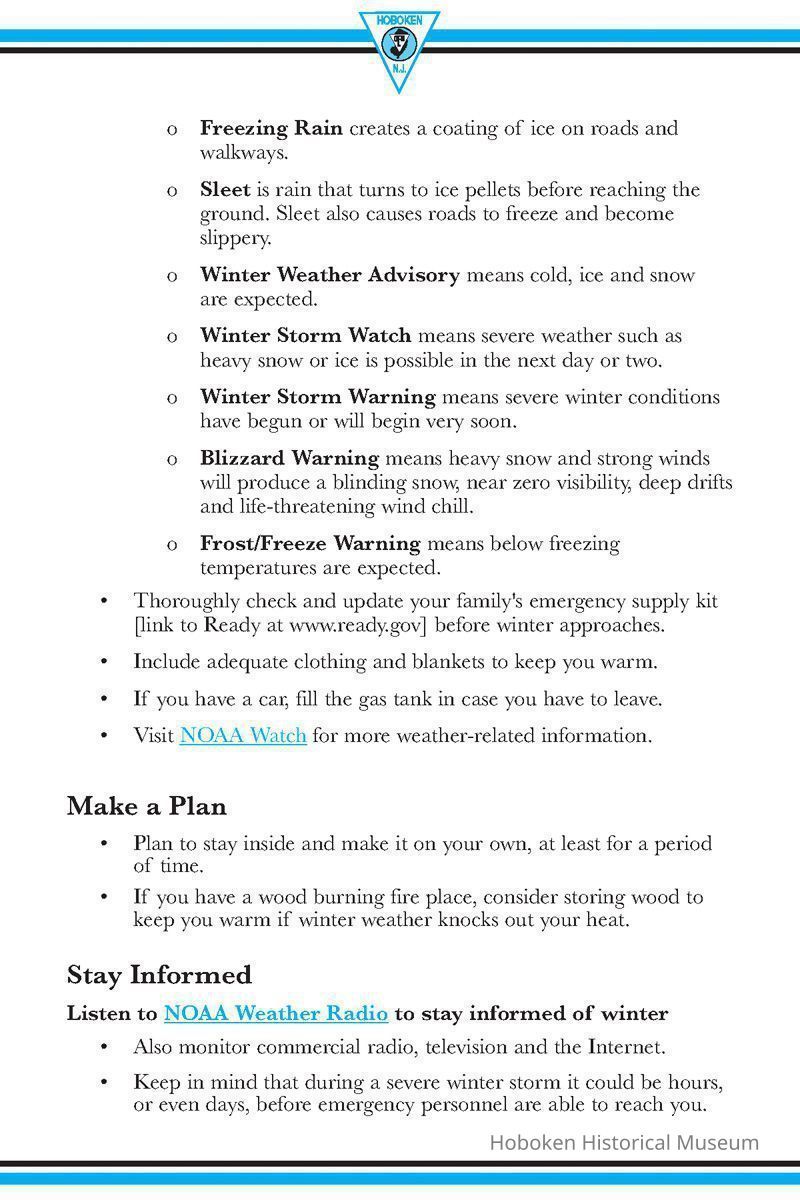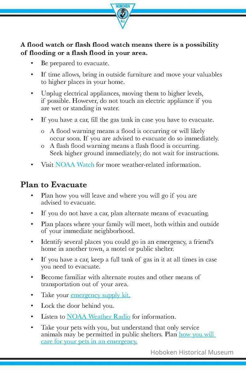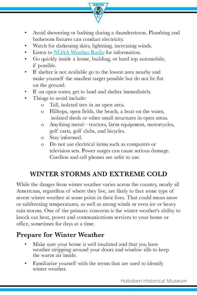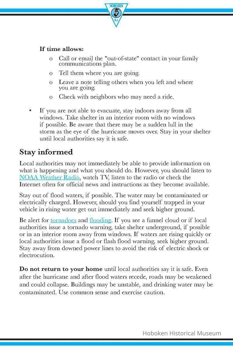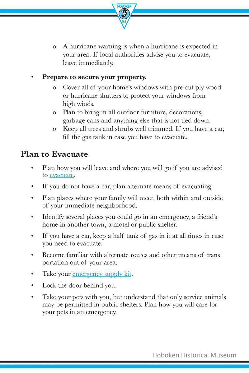 The City of Hoboken Office of Emergency Management wishes to acknowledge the contributions to the content and design of this booklet to the following sources: The Federal Emergency Management Agency, American Red Cross, New Jersey Department of Homeland Security [cataloguer's note: this agency was established in 2006], New Jersey State Police Office of Emergency Management, Ready Together New Jersey, Ready Now, Hoboken Police Department, Hoboken Fire Department, and Hoboken Divisions of Environmental and Human Services.