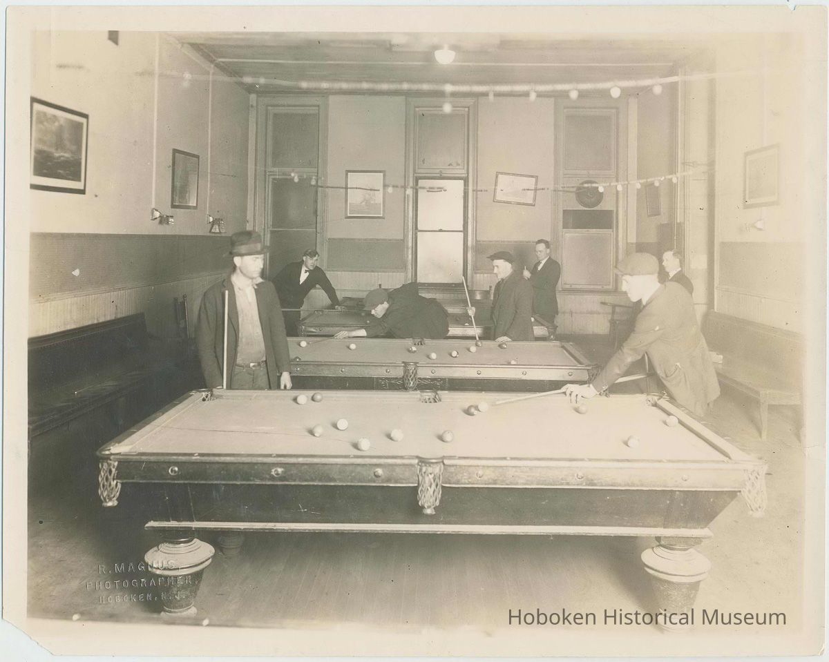 Sepia-tone group photo of men playing billiards or pool at the Hoboken YMCA, Hoboken, no date, ca. 1918-21. 8" x 10" wide print. Photographer's blind emboss at lower right. Holographic pencil notations on the reverse indicative of mark-up for use in a publication. None of the individuals are identified.
