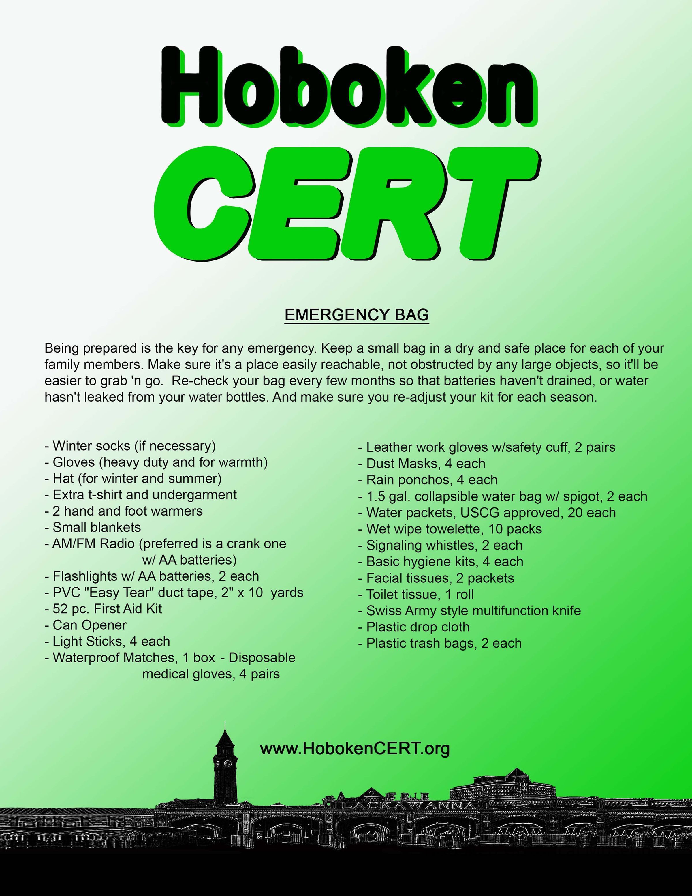 Hoboken CERT Emergency Bag flier or poster. 2013.