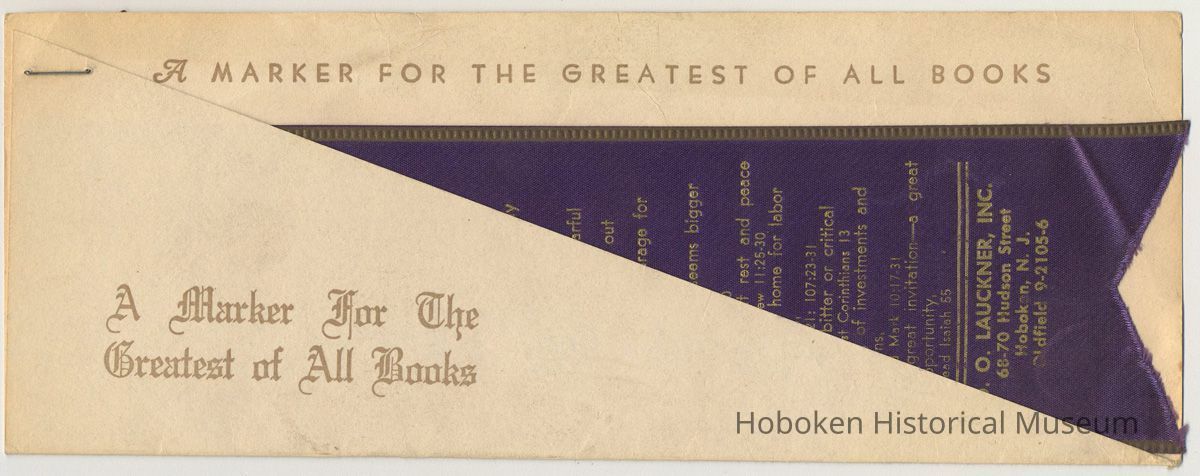 Printed bible bookmark in presentation sleeve from O.O. Lauckner, Inc., 68-70 Hudson St., Hoboken, no date, circa 1950-1960. Purple ribbon, 2-1/4" wide x 9" high imprinted in gold; printed paper sleeve.
