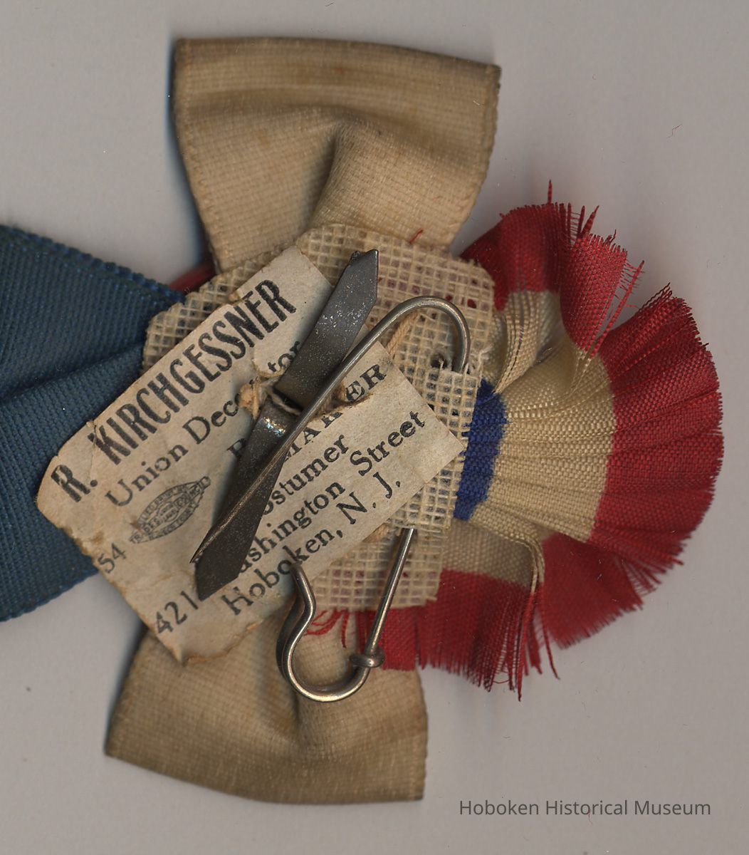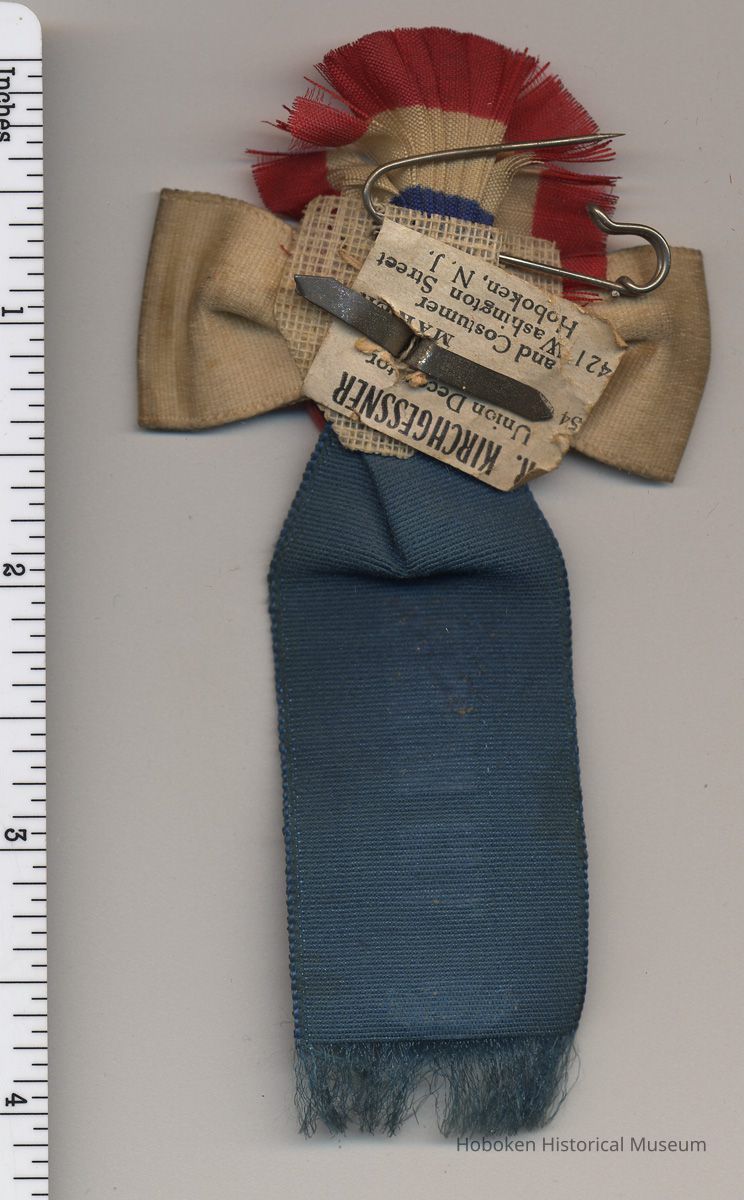 Badge: 1891 - 1916. V.S.V. of H.C. [Vereinigte Schweizer-Vereine von Hudson County.] Button with patriotic crest, cream grosgrain bow and teal ribbon stamped "Decoration Com[mittee]" in silver gilt with union label mark at bottom; safety pin. Button, 1" diameter; overall 4-1/4" high x 2-1/2" wide. Printed maker's label on back: R. Kirchgessner, 421 Washington St., Hoboken, N.J.