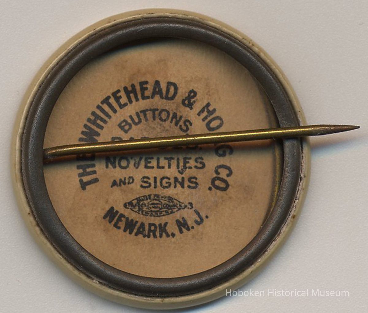 Button: Continental Hotel. Tel 1147 Hoboken. Hoboken, N.J. Joseph Samperi, Prop. No date, circa 1923-1929. Pin back button, 1-1/4" diameter. Made by The Whitehead & Hoag Co., Newark, N.J. as marked on back.