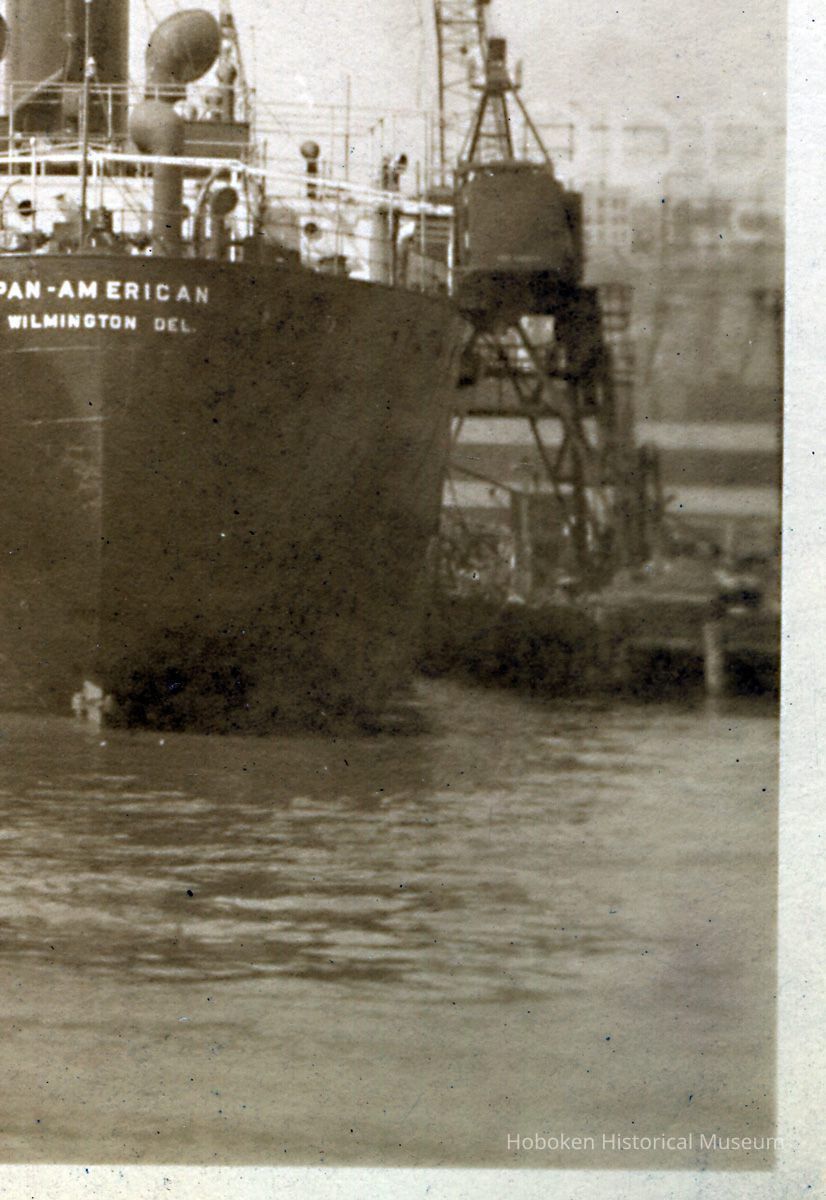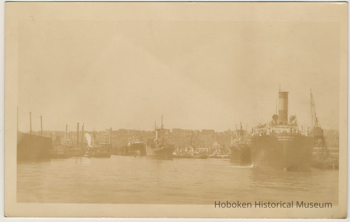 In the right background is the large Todd Shipyards Corp. sign (building was actually in Weehawken) which was built when the drydock yard was expanded in 1943-1944. The ship in the right foreground is the Pan American, an oil tanker of the Pan American Petroleum & Refinery Company, which went was delivered to its owner on Dec. 23, 1937. Names on other vessels are not fully legible.