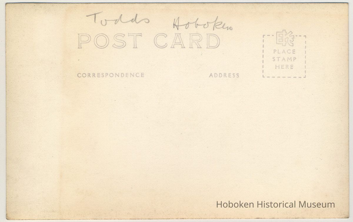 Postcard: view of the Todd Shipyards, Hoboken, N.J., no date, circa 1944-1950. Unposted. Real photo postcard (EKC stamp block); undivided back. 3-3/8" high x 5-3/5" wide. Photographer is not indicated.