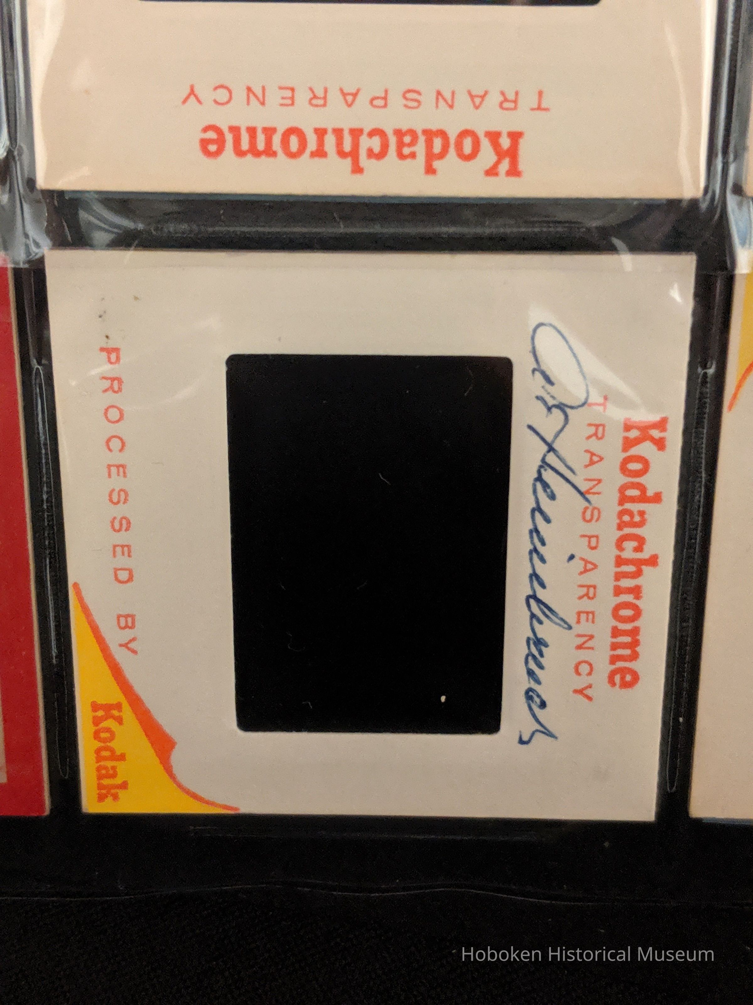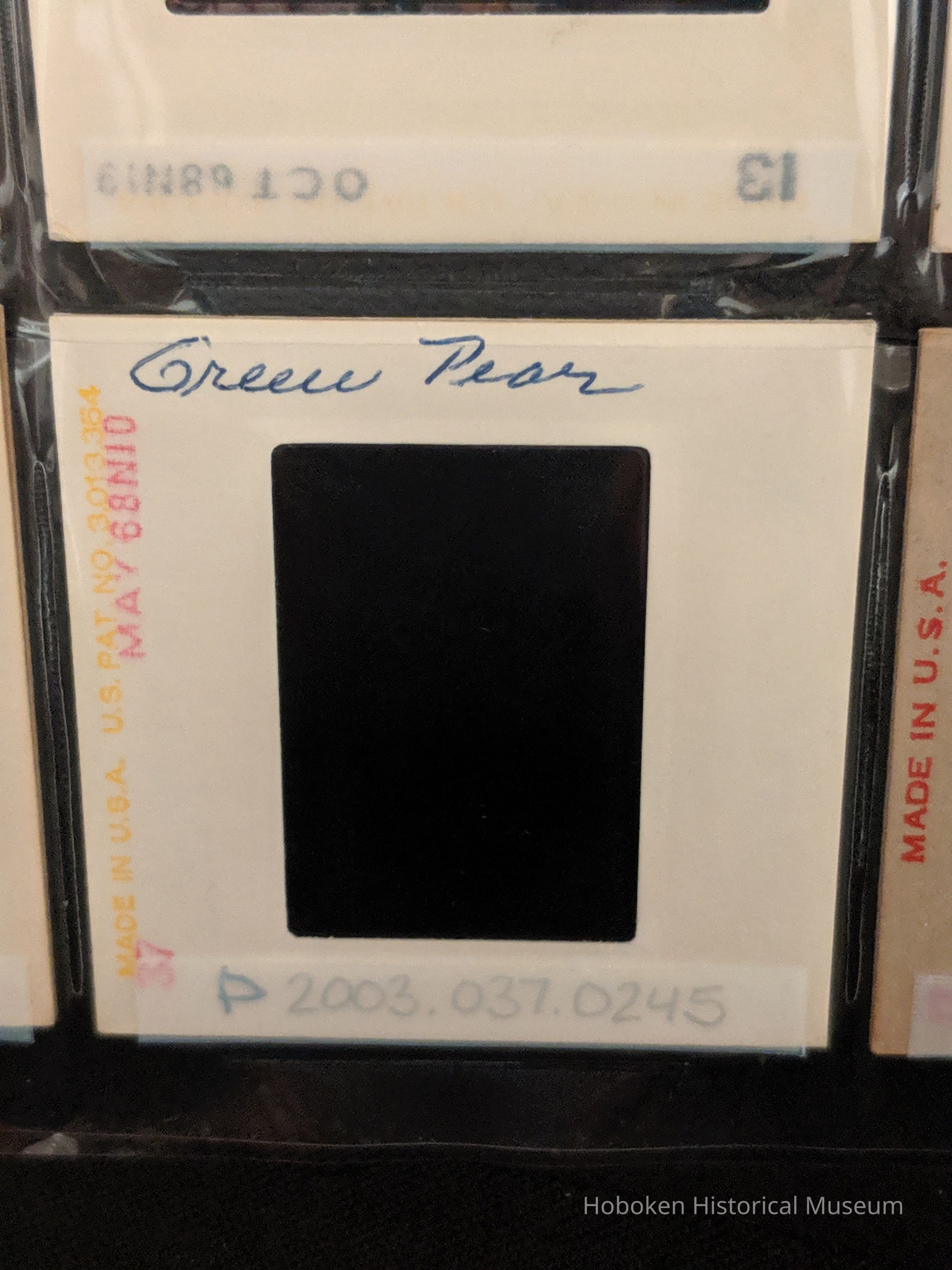Slide is in a commercial Kodachrome Transparency mount with date "MAY 68" printed on side. Photographer's own handwritten label "Green Pear" in pen is on top of slide and a "P" in pen is in lower bottom corner. In pen on back of slide is "A. Heimbruch" in pen.