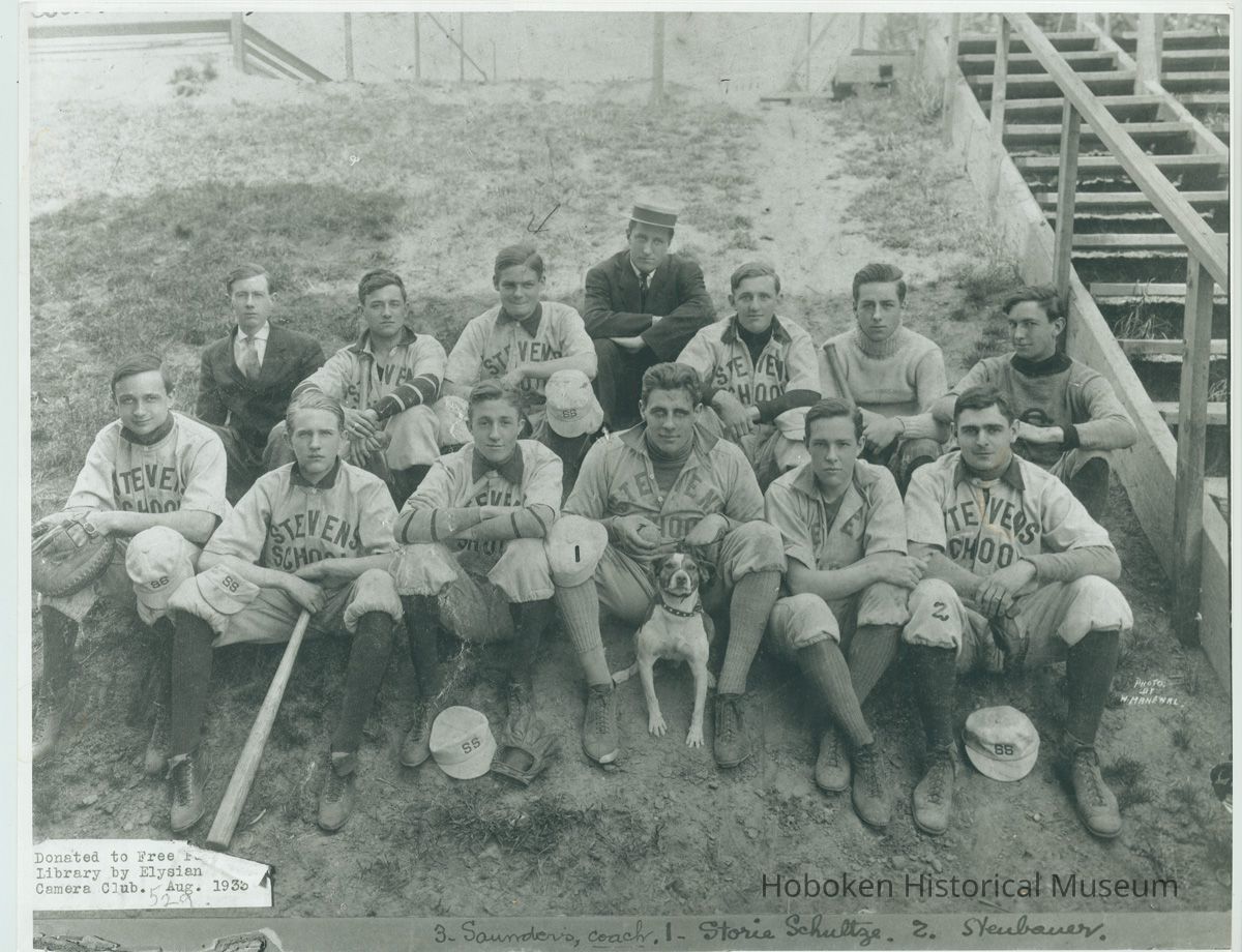 HPL Catalog (2001.137.0001) citation under Sports: Stevens School (on Stevens Tech campus) baseball team in uniform with dog mascot near Castle Point steps, ca. 1900-1915; 1. Storie Schultze, 2. Neubauer, 3. Saunders (coach). Photo by Wm. Manewal. (Donated by the Elysian Camera Club.