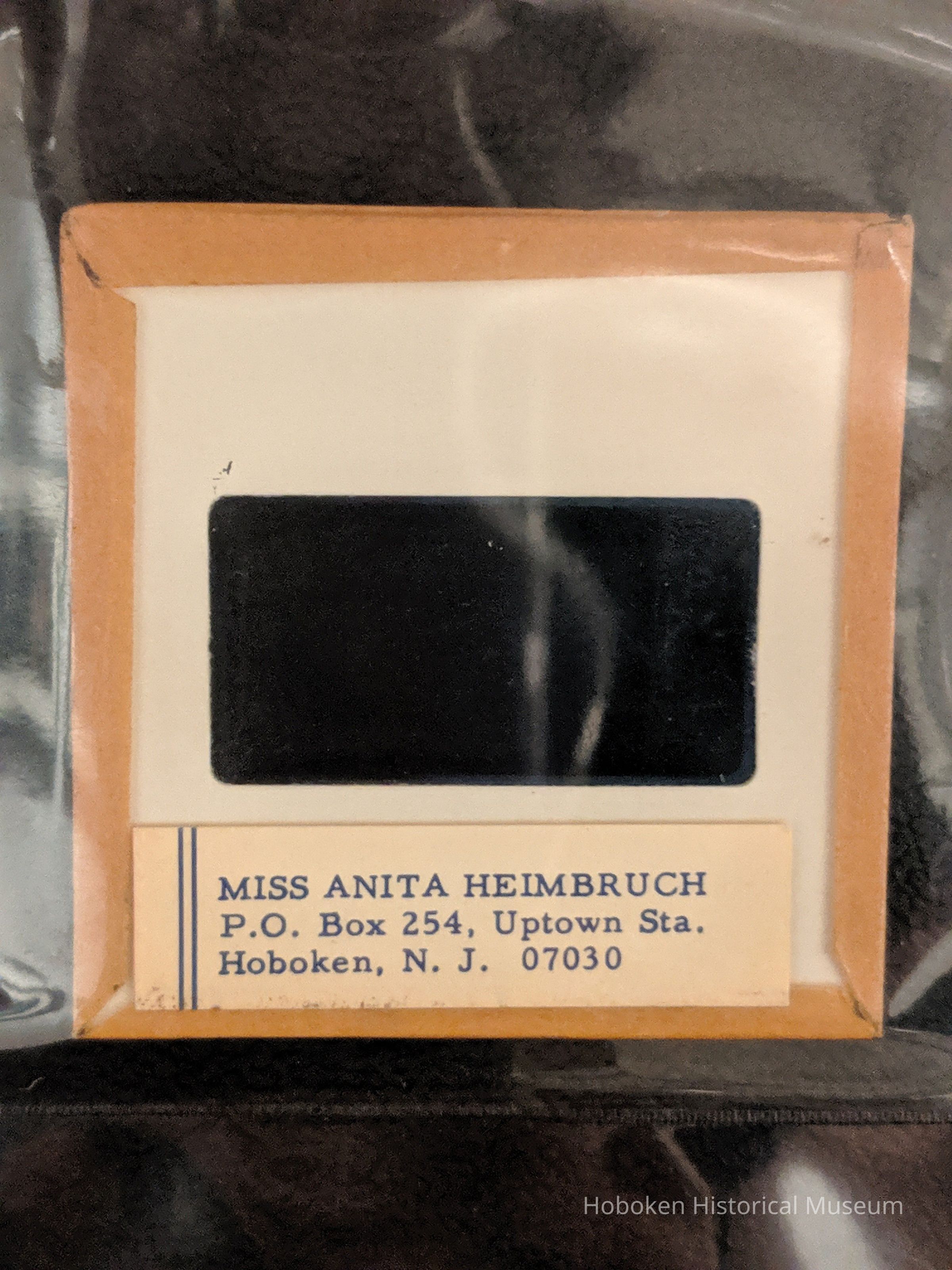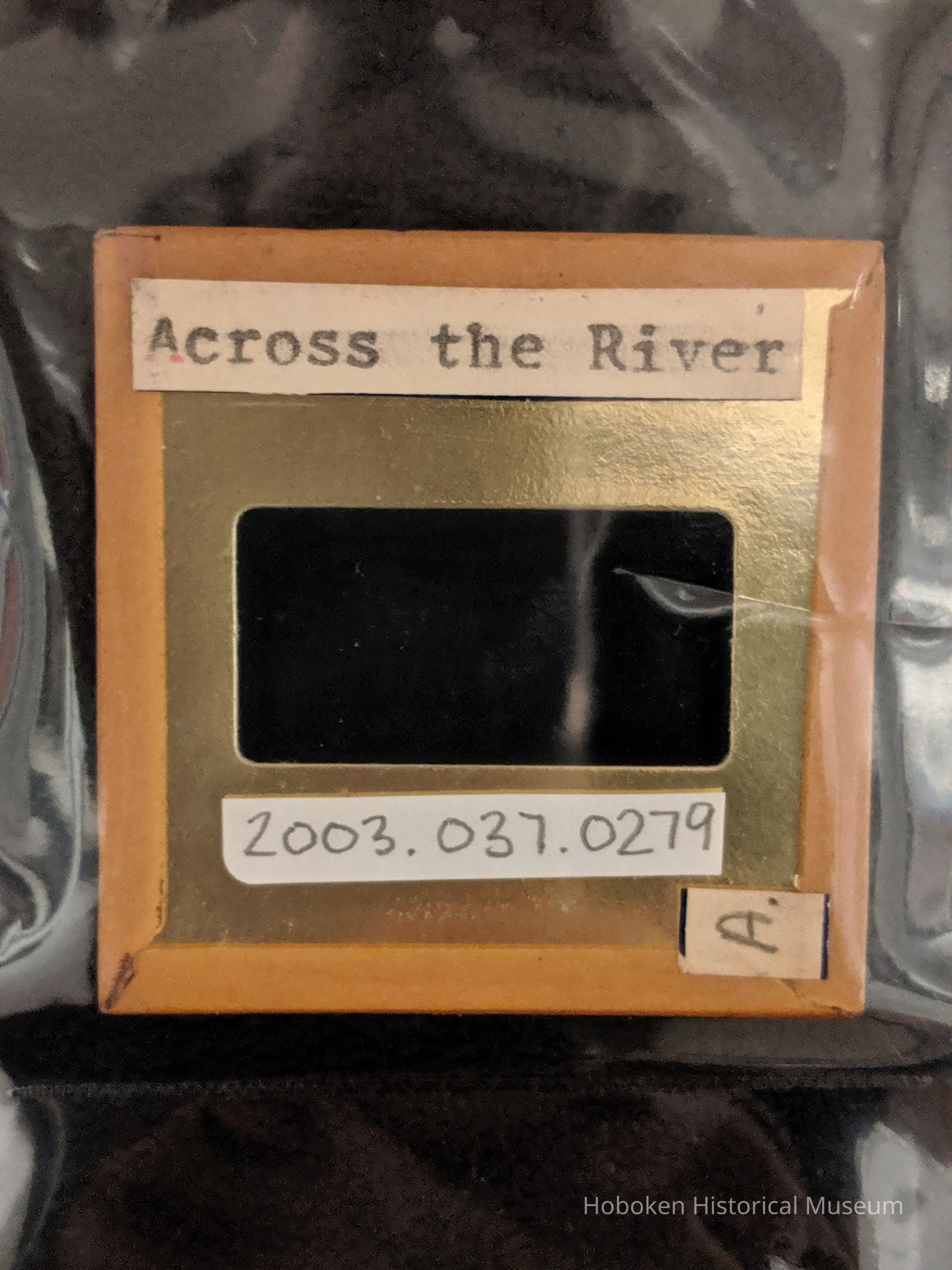 Slide is in a glass mount with the photographer's own typewritten label "Across the River" on top and a white sticker with a handwritten "A" in pencil in the lower right corner. On the back there is an address label that reads: