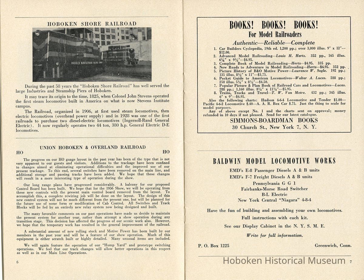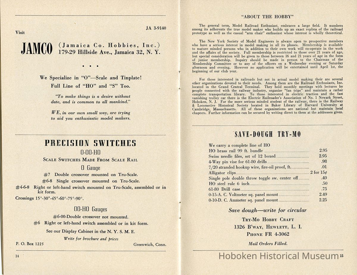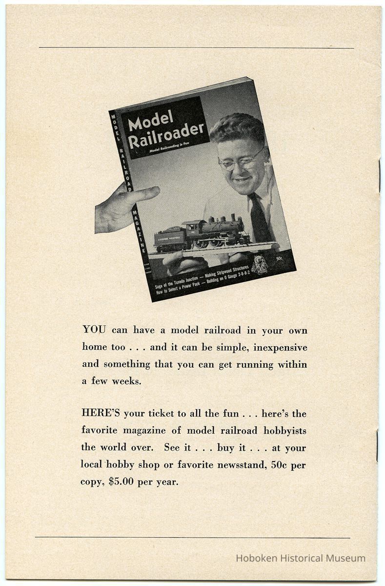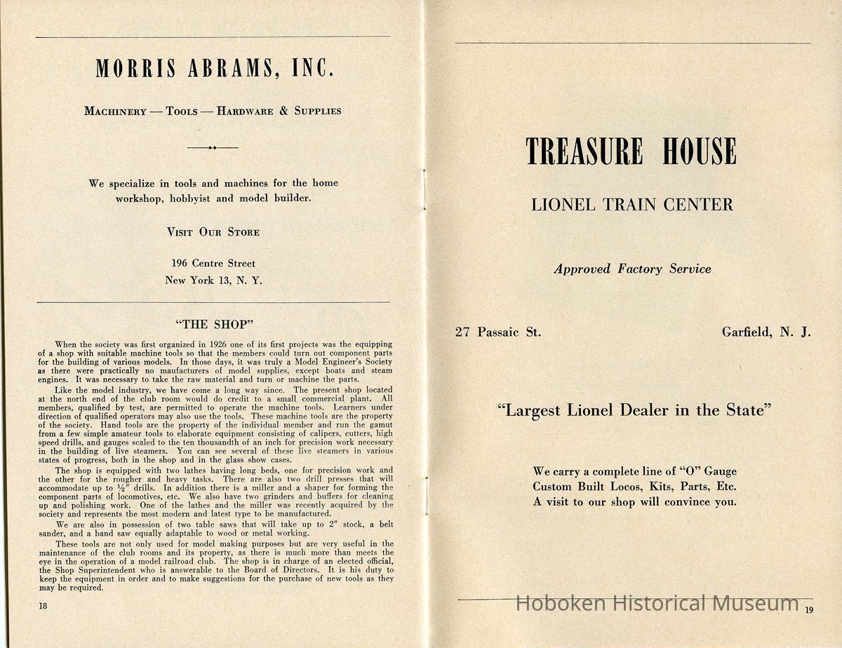 Notes: Text as found in 2012 at the History section of the New York Society of Model Engineers (NYSME) website: http://modelengineers.org/history.htm The Lackawanna Railroad discontinued some of their ferry service after World War II, and we were able to secure the upper ferry concourse at the Hoboken Terminal. At this site we built the largest model railroad in the world at that time. In 1958, the Society was evicted again, this time by the United States Postal Service. The concourse was going to serve as a mail sorting area. But after the railroads were dismantled, the USPS decided to let the airlines handle first class mail. The concourse was never occupied and we were invited to move back. By that time, however, we had purchased our own building and moved to our current location in Carlstadt, NJ. Status: OK Status By: dw Status Date: 2014-11-06