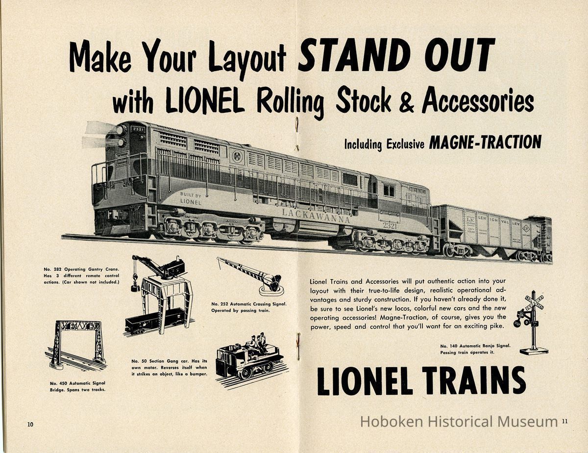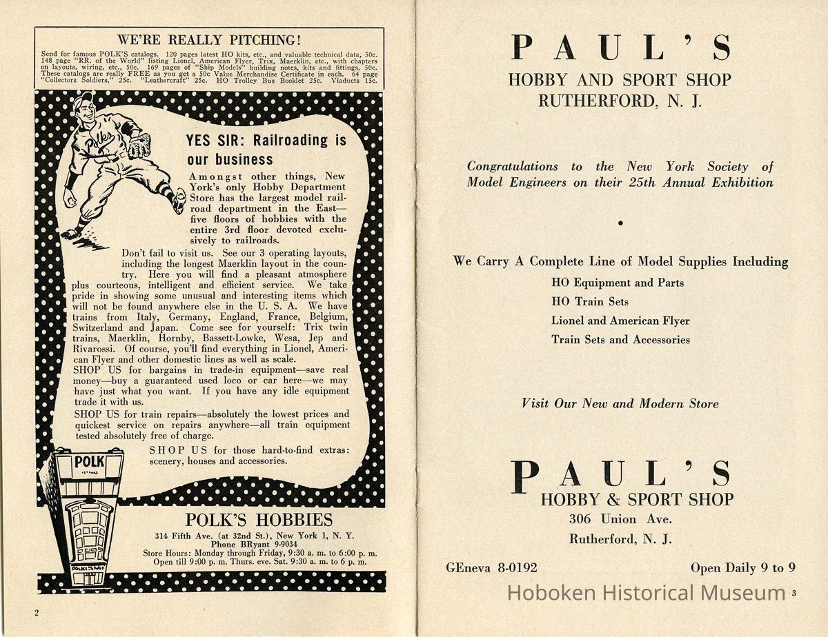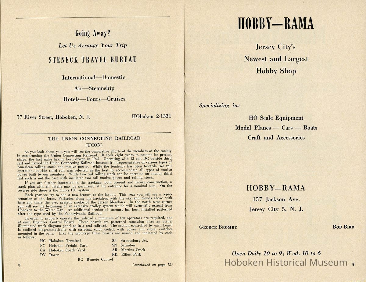 Notes: Text as found in 2012 at the History section of the New York Society of Model Engineers (NYSME) website: http://modelengineers.org/history.htm The Lackawanna Railroad discontinued some of their ferry service after World War II, and we were able to secure the upper ferry concourse at the Hoboken Terminal. At this site we built the largest model railroad in the world at that time. In 1958, the Society was evicted again, this time by the United States Postal Service. The concourse was going to serve as a mail sorting area. But after the railroads were dismantled, the USPS decided to let the airlines handle first class mail. The concourse was never occupied and we were invited to move back. By that time, however, we had purchased our own building and moved to our current location in Carlstadt, NJ. Status: OK Status By: dw Status Date: 2014-11-06