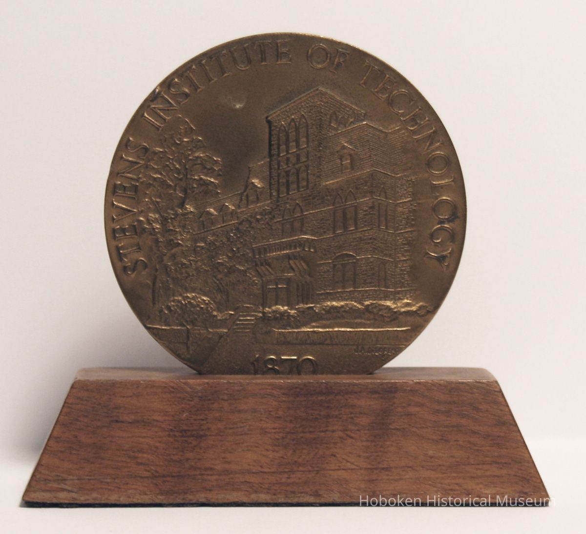 Commemorative medallion: Stevens Institute of Technology Centennial, 1870-1970. (Hoboken, 1970.) Bronze metal with lettering and decorated relief both sides, 3-1/4" diameter x 3/16" thick. Designed by J.A. Dilorenzo as marked. With: walnut wood stand, 3-7/8" wide x 1-1/8" deep x 7/8" wide; beveled sides; felt bottom; 1-1/4" wide top slot for holding medal.