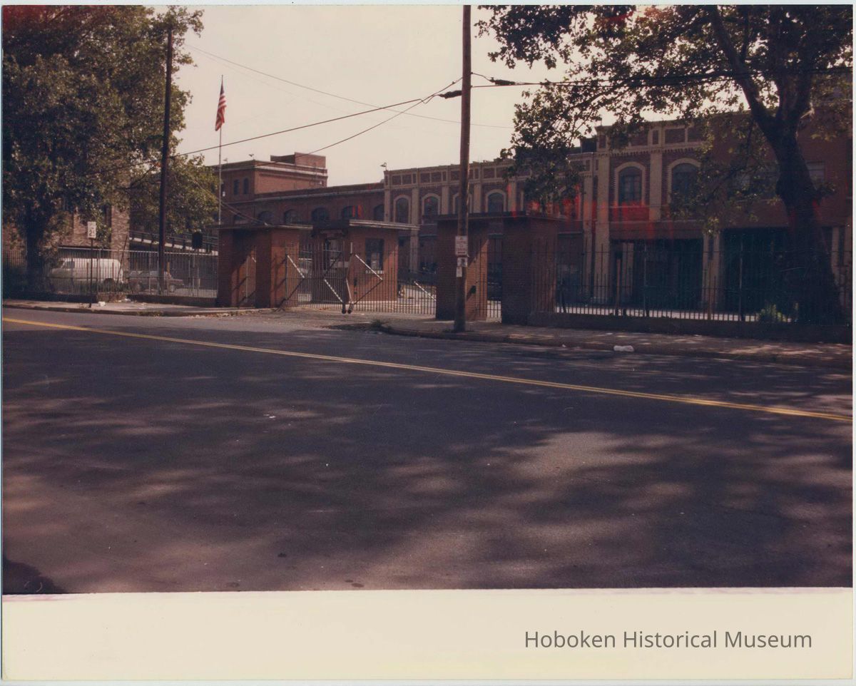 Color photo of an entrance gate to the Port Authority piers on River Street between 2nd & 3rd Sts., Hoboken, no date, ca. 1975.