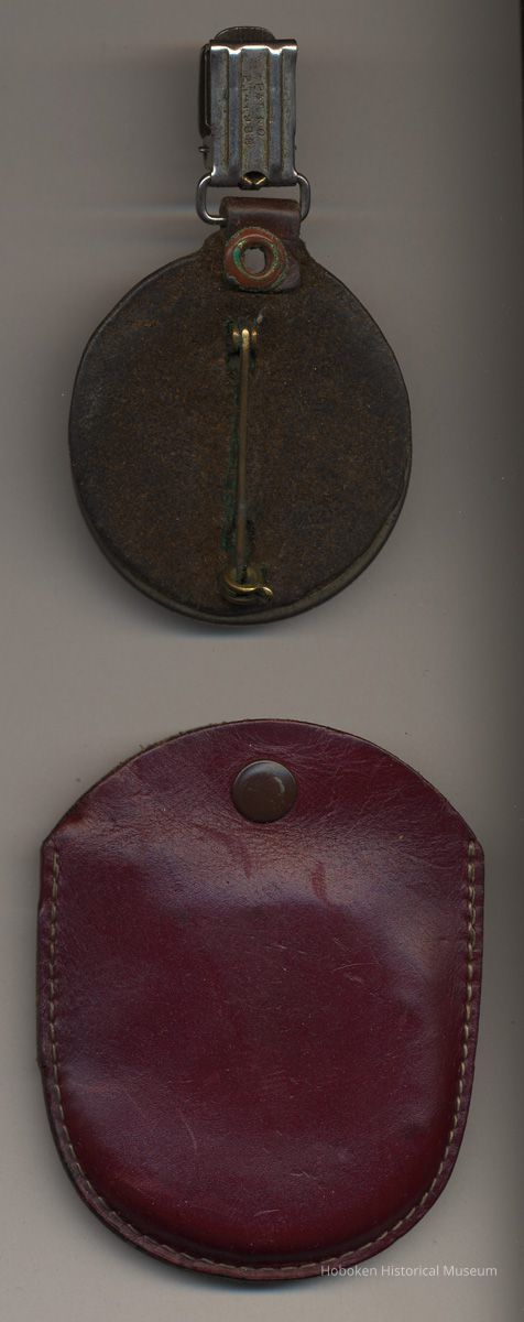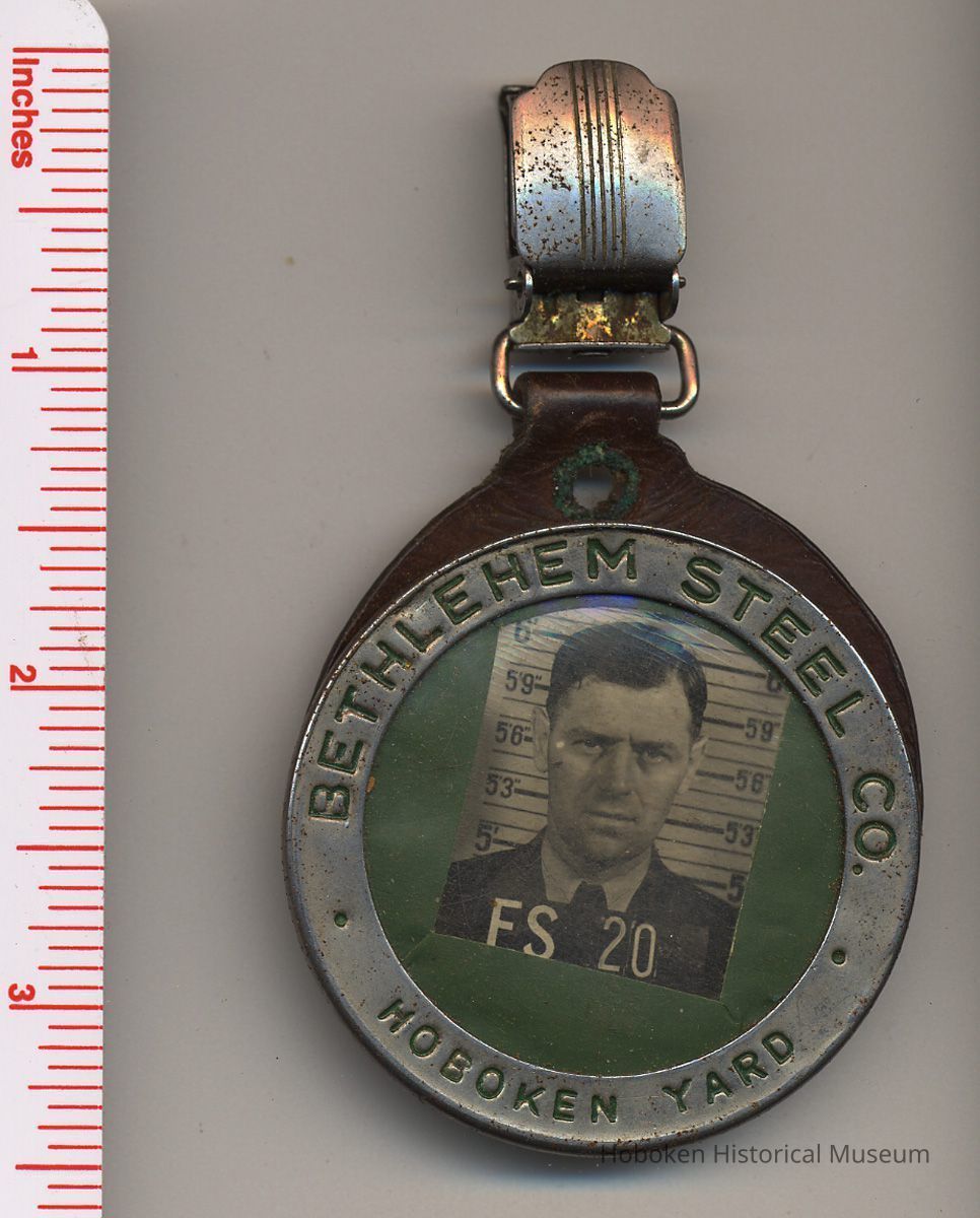 Photo identification badge of Martin Veth from Bethlehem Steel Co., Hoboken Shipyard, no date, circa 1940s. 2" diameter stamped metal badge, pin back, with celluloid window; photo of employee. Leather backing, not original as issued, with attached suspender type clip; leather sleeve enclosure with button snap.