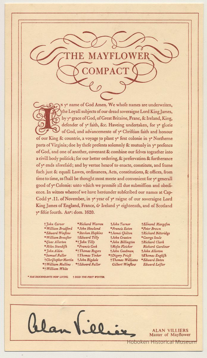 Enclosure: The Mayflower Compact. Holographic signature at bottom of Alan Villiers, Master of the Mayflower (II). The text of the compact is printed along with the names of the signers. Asterisks indicated those men who had descendants now living and daggers for those who died in the first year.