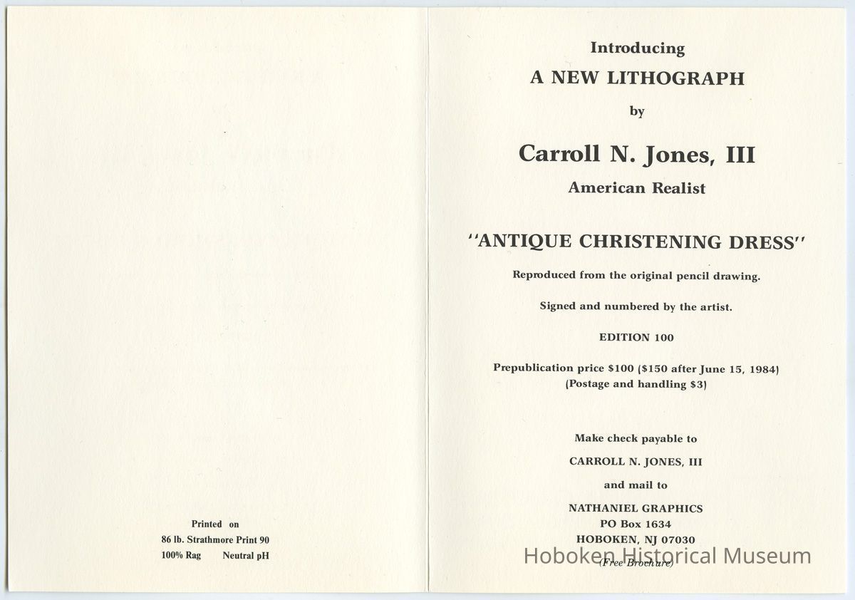 Announcement card: Introducing a New Lithograph by Carroll N. Jones, III, American Realist, "Antique Christening Dress." Nathaniel Graphics, Hoboken, N.J. 1985.