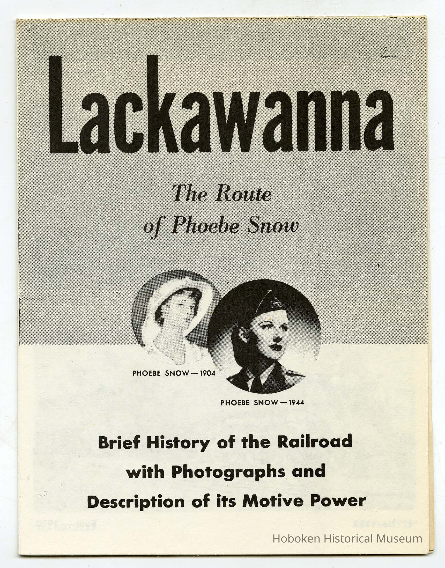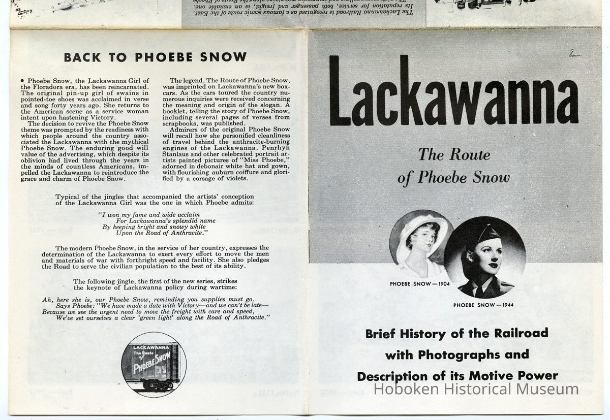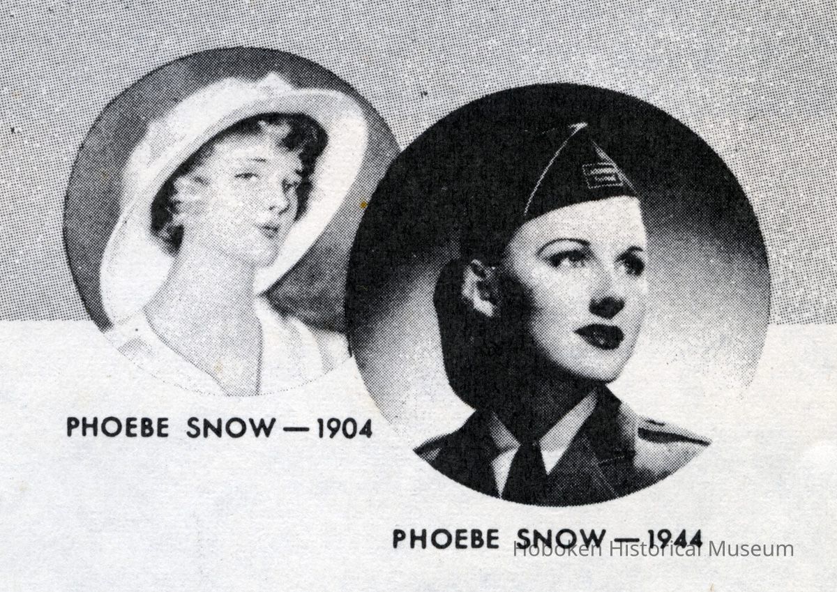 Cover has two vignette portraits: Phoebe Snow - 1904 (artist's illustration); Phoebe Snow - 1944 (photograph of woman in railroad uniform - note Lackawanna Railroad patch on military style cap.)
