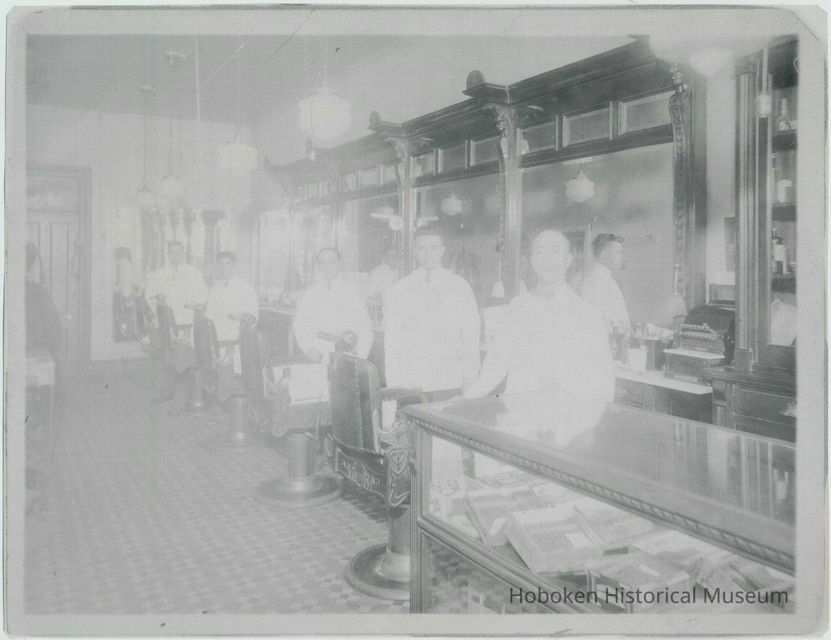 B+W velox of photo of the interior of a barbershop at 1312 Washington Street, Hoboken, no date, ca. 1940.