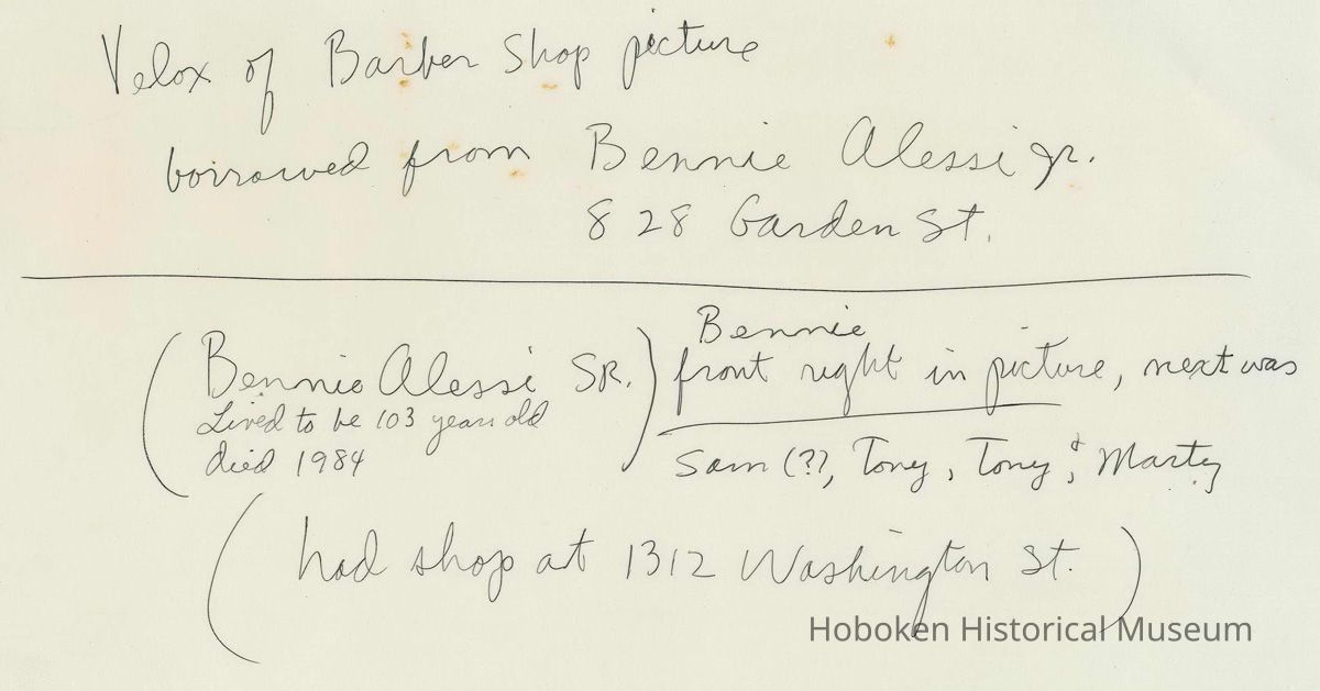 Black-and-white velox of photo of a barbershop interior with five barbers at 1312 Washington Street, Hoboken, no date, ca. 1940. 8" x 10" print. Holographic ink text on the reverse by R. Foster.