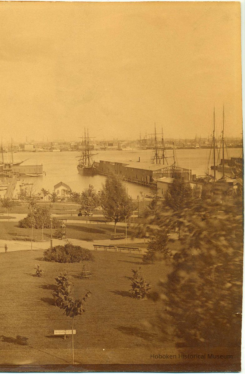An elevated view looking southeast towards the Hudson River. The park is now known as Stevens Park, between Fourth and Fifth Streets. This image was used by the photographer as a published photographic postcard.