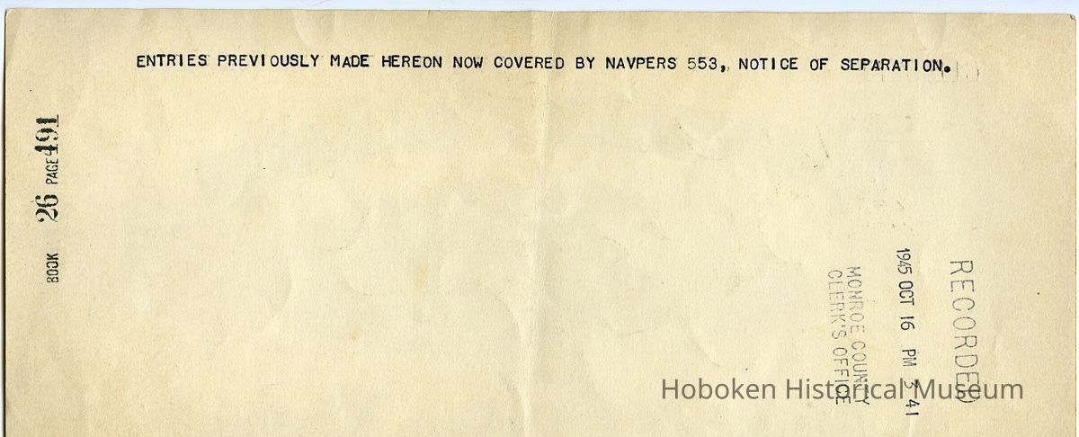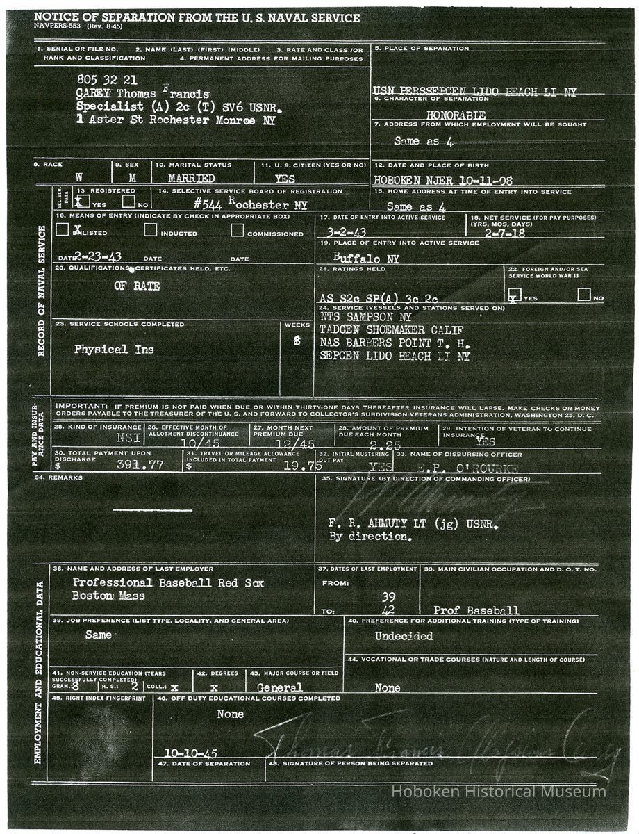 With xerographic copy of form: Notice of Separation from the U.S. Naval Service. Note that his birth date is stated on this document as 1908 which was not apparently correctly known as 1906 to Carey until 1968 - see archives 2015.010.0002. Also notable is his listing of last employer, "Professional Baseball Red Sox Boston, Mass.," and his occupation, "Prof. baseball."