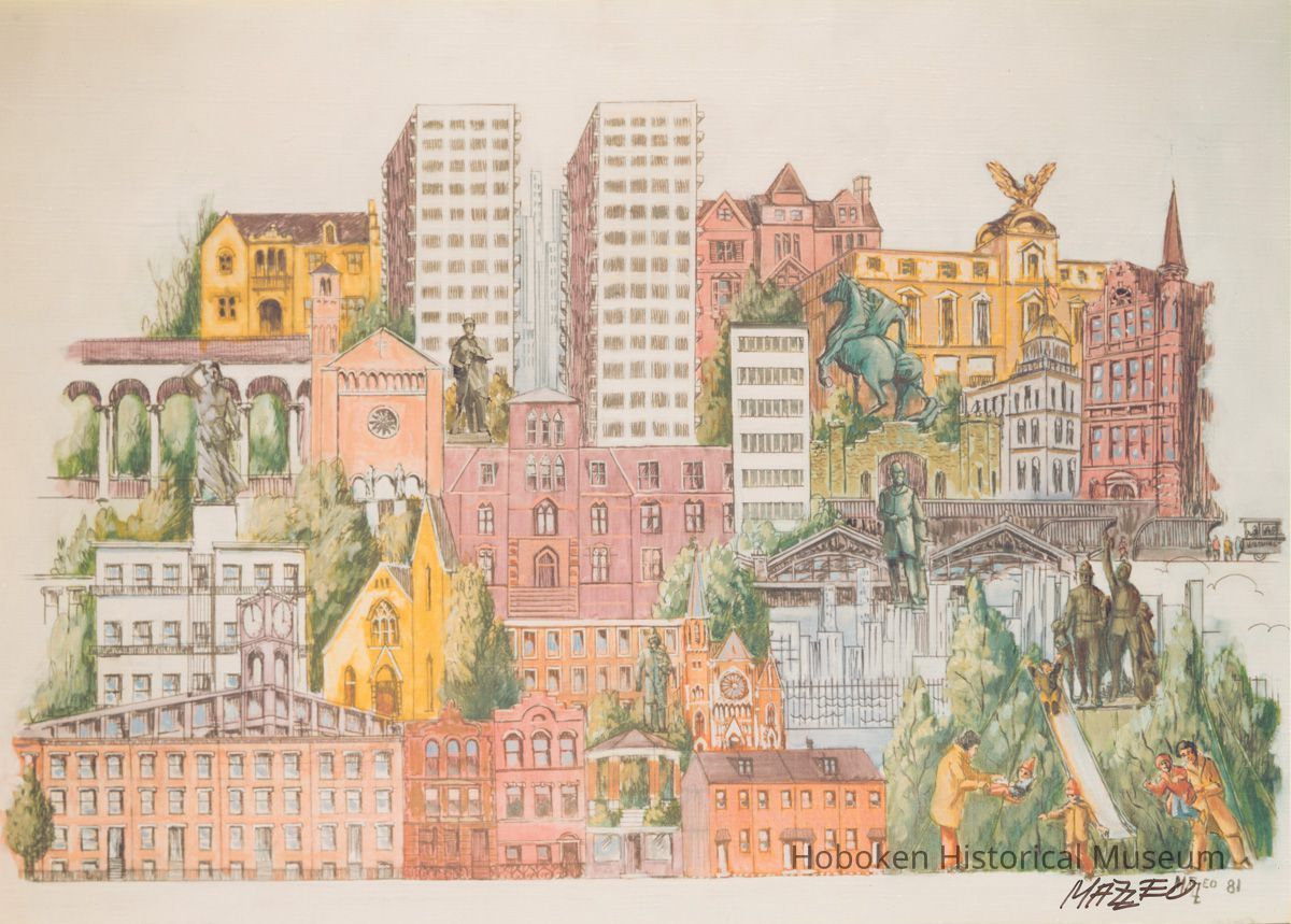 Color photo of a painted montage of Hoboken buildings by Francis Mazzeo, signed, dated in image 1981. 10" high x 14" wide image on 11" x 14" print. Signed "Mazzeo" with black pen at lower right. Also artwork was signed and dated in image. Reverse is blank.
