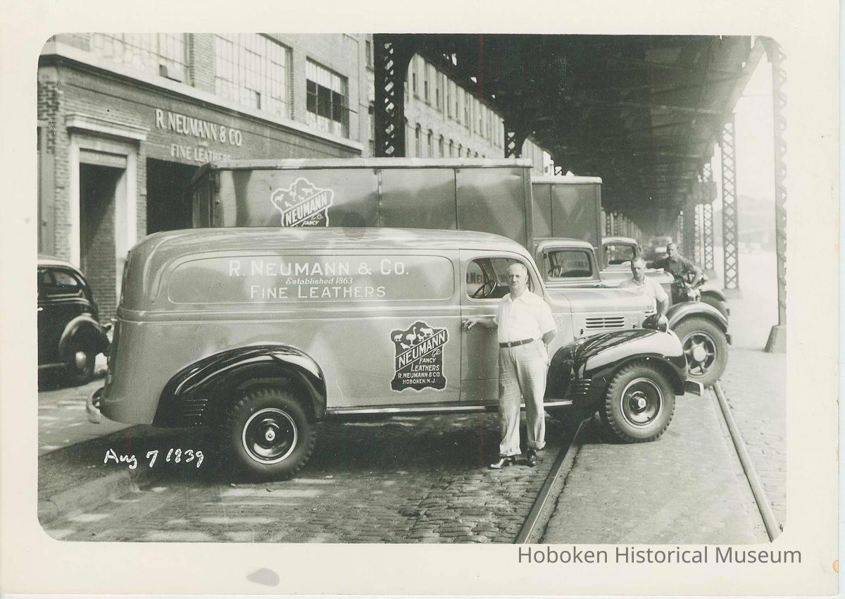 Black-and-white photo of trucks of R. Neumann & Co. parked on Observer Highway west of Willow Avenue, Hoboken, August 7, 1939. 5 x 7" wide print. Reverse is blank. Photographer is unknown.