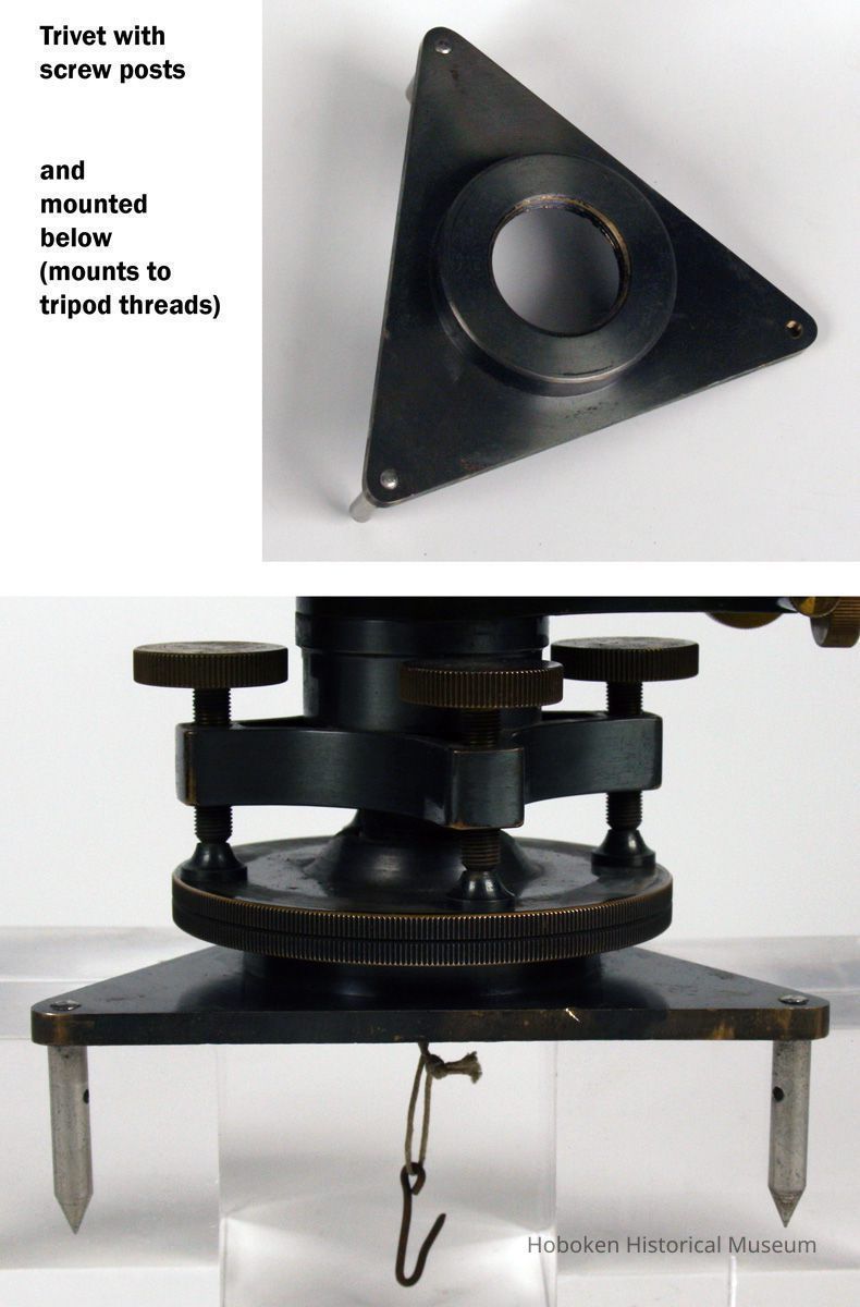 Level with dust cap; sunshade; 2 trunnions (used as removable axis for vertical sighting; metal trivet with two (lacking one) removable legs; plumb box; an accessory tool whose function is not yet determined. Non-brass metal parts have gun metal finish.