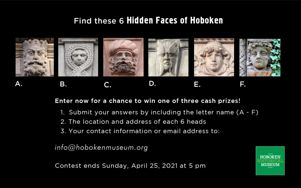 “The Hidden Faces of Hoboken,” which opened on March 14, features about 20 framed images he’s taken and printed in black and white, with several more in color. In addition, the Museum’s Artist’s Talk with Museum Director Bob Foster, which is now archived on YouTube, will be available on a monitor. The interview also features some highlights of Shaughnessy’s graphic design work (he does most of the Museum’s signs, posters and postcards) as well, and contains information about the Find the Hidden Faces of Hoboken contest that concludes on the show’s closing date of Sunday, April 25, at 5 pm.